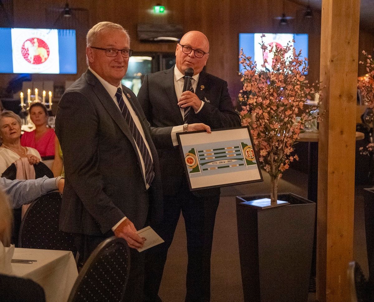 Presidenten forærte klubben en plakett og et spranghinder som skal produseres i løpet av høsten. -Vi håper denne gaven kommer alle til gode, både topp og bredde, sa presidenten.