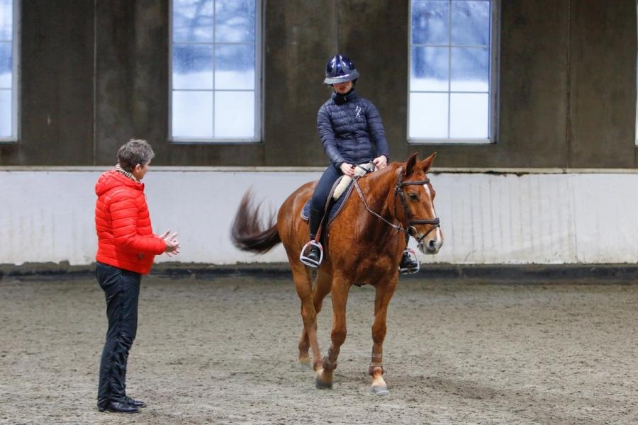 -Undersjenkelen ligger naturlig inntil hesten med et trykk på 30 gram. Et trykk på 30 gram gir et svingende bekken og rolig sjenkel, hvilket gjør at hesten lettere kan løfte opp ryggen og brystet, forklarer Lillian. - Sjenkeltrykket kan gå opp til 100-130 gram hvis man trenger mer, i et øket trav snakker man om et trykk på 120-130 gram. Trykker man hardt, vil det gå utover finheten i hjelperne, og rytterens mulighet til å følge med i hestens bevegelser, det vil si at hestevelferden påvirkes negativt på flere måter. Rytteren må vite når og med hvilket trykk sjenkelen brukes.