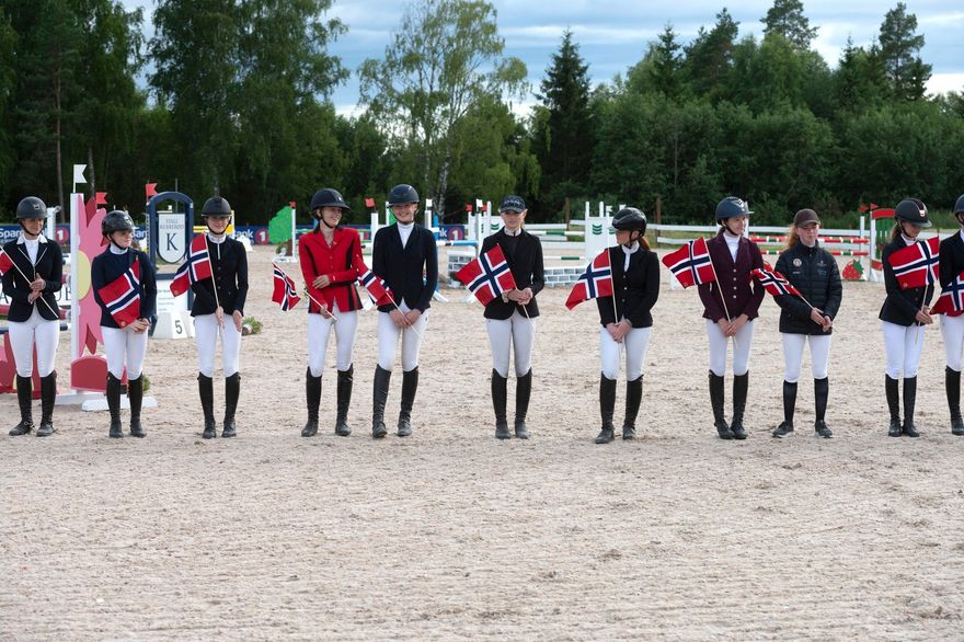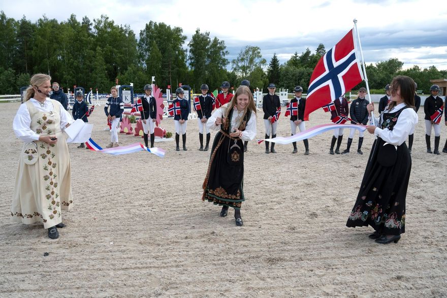 - Selma Haasun Poole og Celina Fjeldavli stod for nydelig sang, og deretter klippet vi snoren som offisiell åpning av NM ponni sprang 2022, fortsetter Gro Sørgaard Gartland. – Klubbens egen HRRK-rytter, Emmeline Pedersen som vant NM ponni kategori 2 i fjor, stod for dette. Alt i alt ble det som sagt en veldig fin seremoni og masse publikum. Vi hadde også warm-up klasser i dag, samt salg av grillmat. Vi har pyntet hele anlegget med norske flagg, og flere nye hinder er også på plass. Kort sagt, vi er veldig klare for hele stevnehelgen med både åpne klasser, cupklasser og selvsagt frøst og fremst NM ponni, avslutter hun smilende.