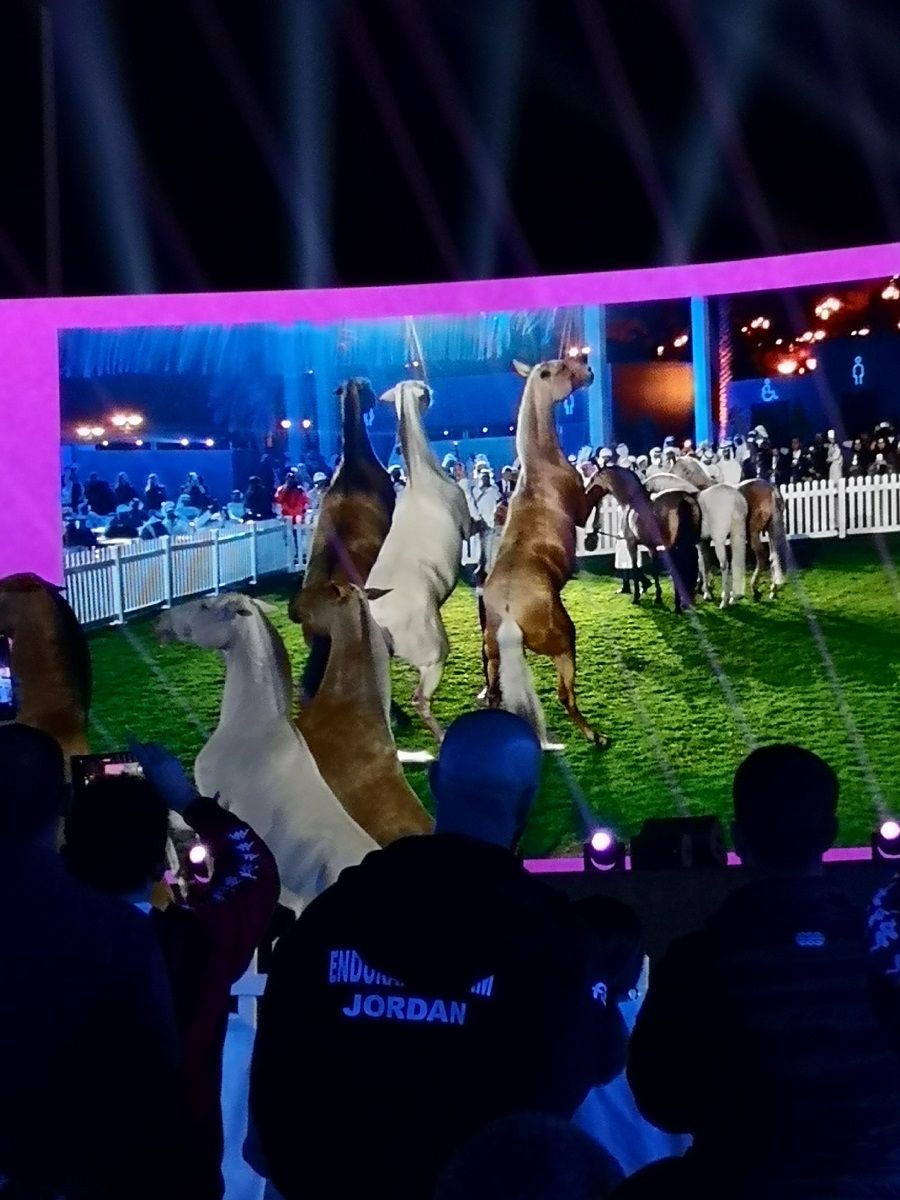 -Torsdag gikk med til trening, møter og ble avsluttet med en storslått åpningsseremoni på Emirates Palace i sentrum av Abu Dhabi. Alle land ble presentert etter åpningstalen, sier Tone. - Deretter ble vi servert flott mat - toppen av kransekaka var en nydelig sjokoladedessert med pynt av 24 karat gull. Den smakte fantastisk! Underveis gjennom måltidet var det flere typer underholdning, blant annet var det et imponerende hesteshow hvor de hadde inne seks løse hester som de gjorde flere triks med. Bare det å ha så god kontroll på dem med lyskastere som gikk og hundrevis av mennesker rundt, alt uten ordentlig inngjerding, det er en prestasjon i seg selv. Åpningsseremoni ble avsluttet med et imponerende fyrverkeri.