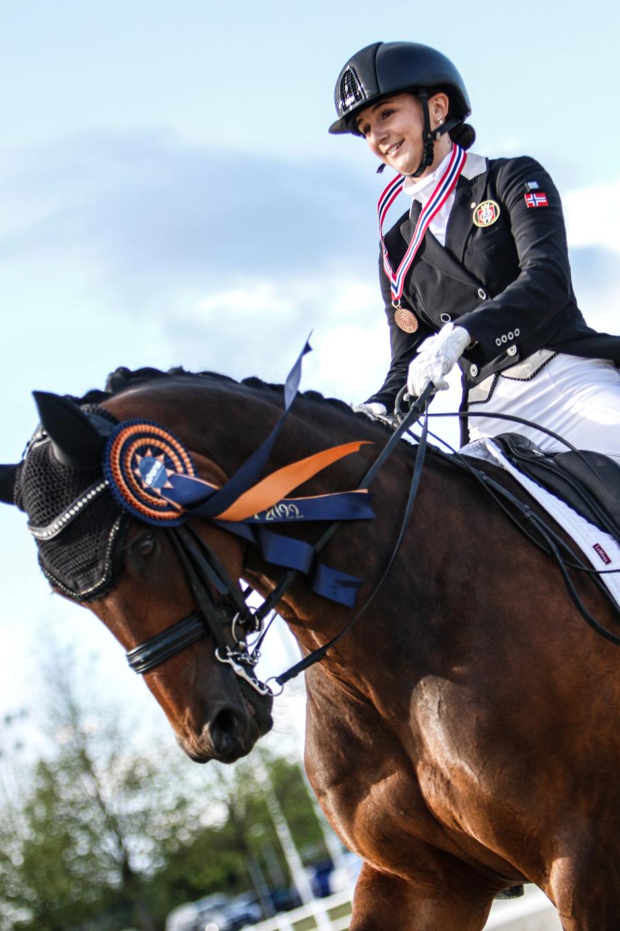 Nora Windgäetter har en deilig hoppe i sin Noesmindes Miami (Blue Hors Rockefeller/Michellino), og sammen danset de rundt i freestylen. Noen feil og noen spenninger trakk noe ned, og fasit ble 67,955 %. Sammenlagt ble det 205,026 poeng på ekvipasjen fra Soma Ryttersportsklubb – det ga bronsen i klassen.