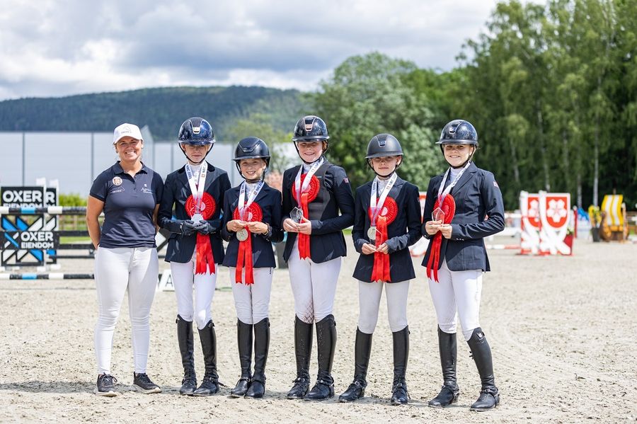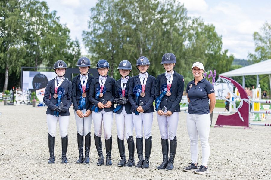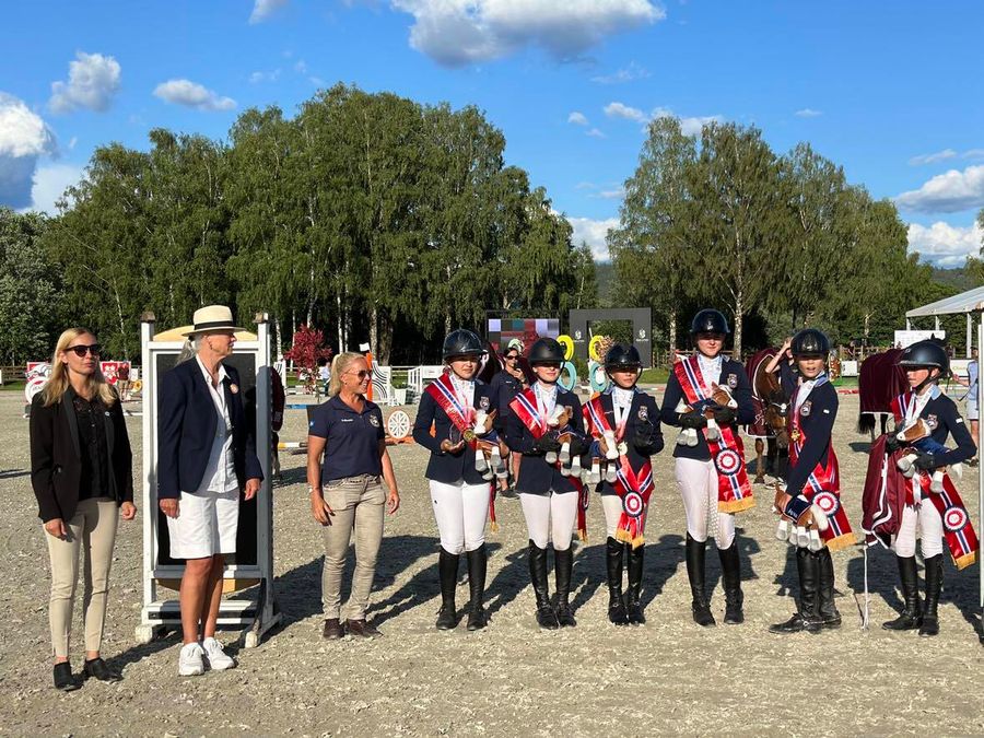 Det svenske children-laget var det ikke noe å gjøre med da de unge sprangrytterne møttes til avgjørende lagkonkurranse over 1,20 m høye hinder fredag på Linnesvollen. Det ble null feilpoeng totalt, men det norske laget var hakk i hæl i klassen som var presentert av Champion. Med flere gode nullrunder ble Norge stående med kun fire feil totalt hvilket ga sølvmedalje til Alexandra Pensgaard Olsen/Corrada H M (Corrado I/Lordanos), Sofia Kingdom-Clark/Coctail (Cardenio 2/Quick Star), Emilie Øia Helgesen/Lady Gaga Hh Z (Lux Z/Pablo van Berkenbroek), Madelen Ossletten Fuglstad/Angelina Jolie Svm Z (Aktion Pur Z/Diarado), Maiken Vandbakk Dragerengen med norskavlede Sancerre (Careful/Rastell, oppdretter Lars Ole Frøland) og Filippa Thon Finne/Dj 40 (Diarado/Grandilot).