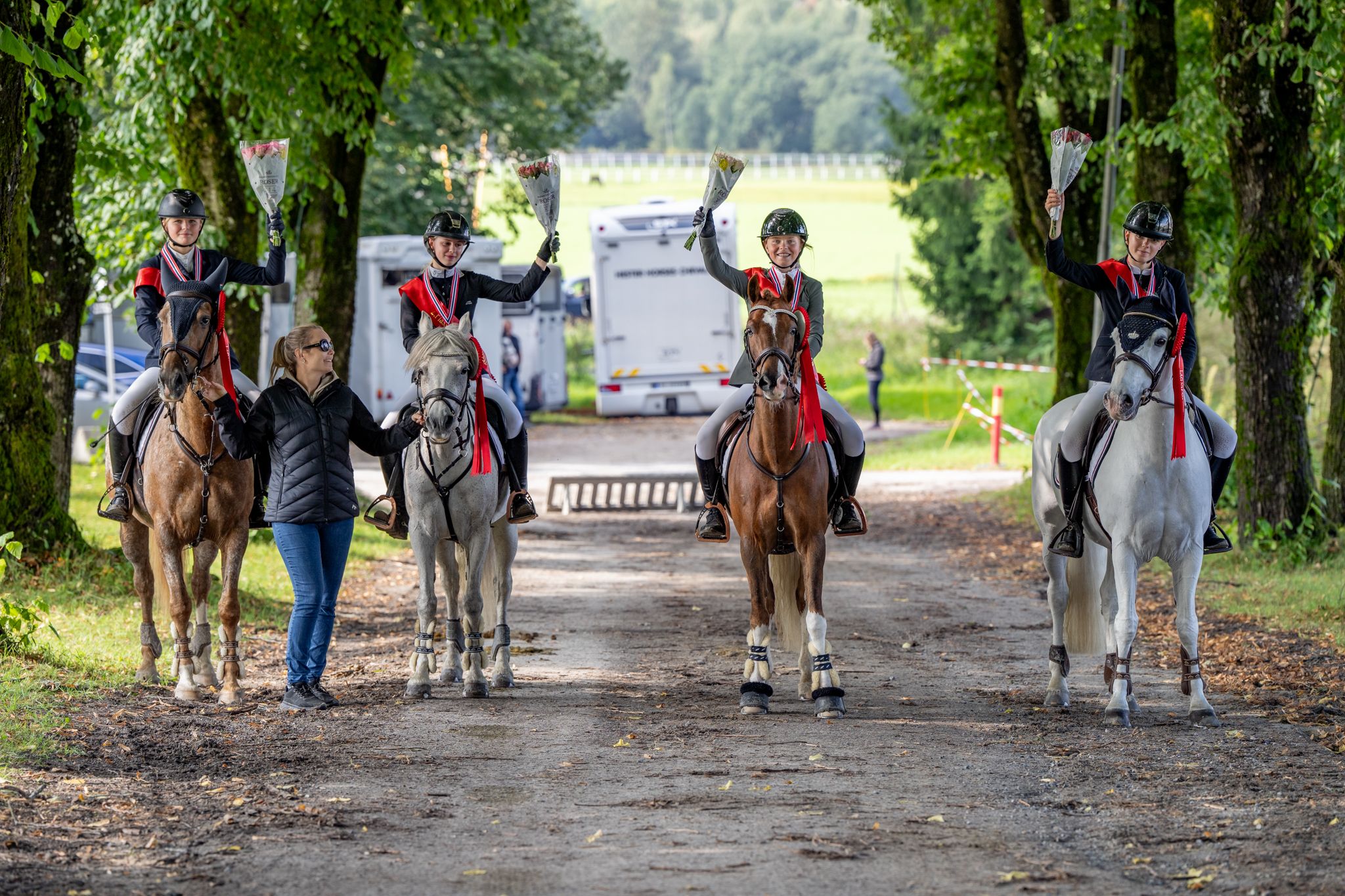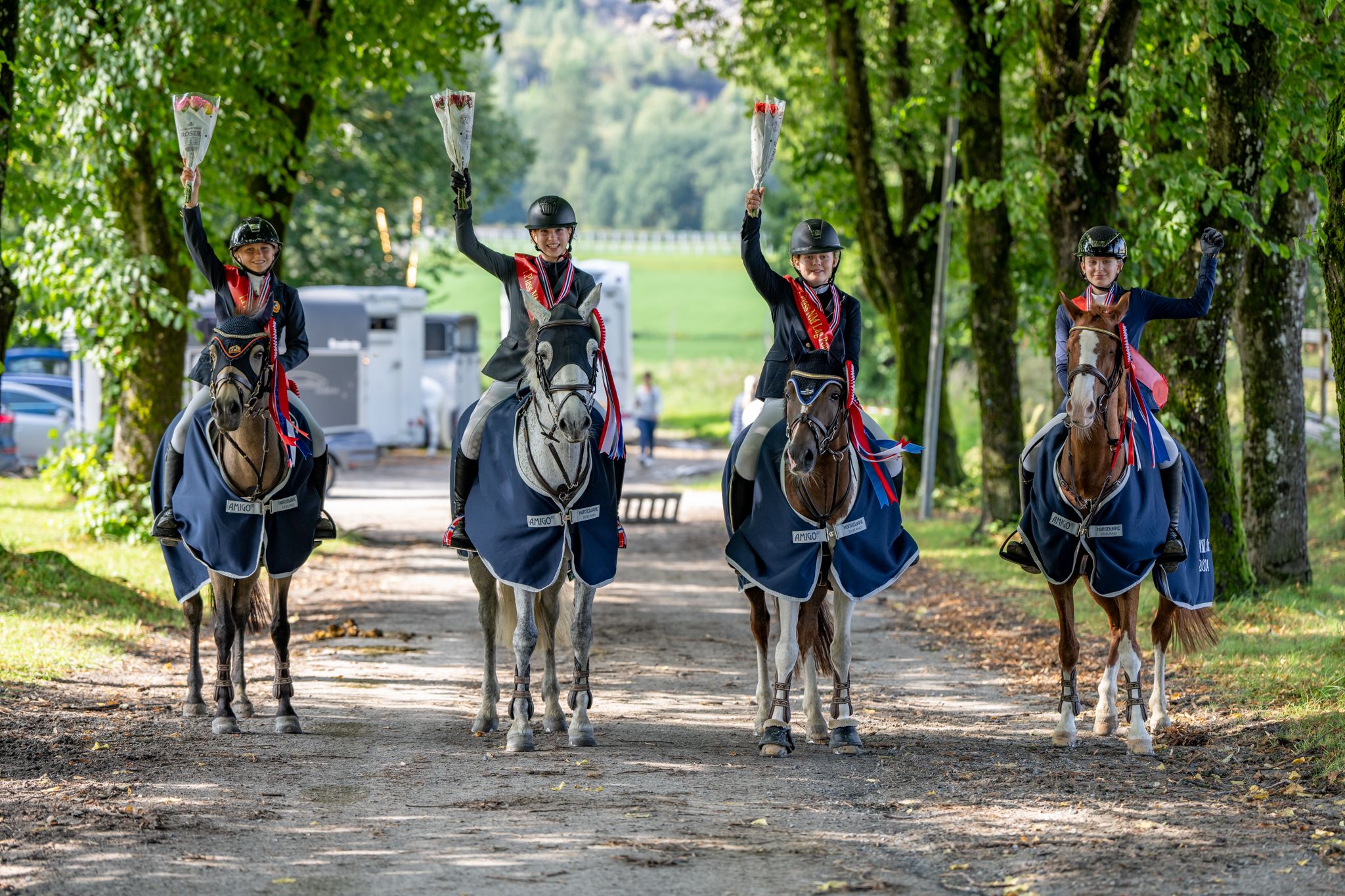 For å få fordelt resten av medaljene måtte det mer ridning til. Både Sandnes og Jæren Rideklubb – ved Sikke Tomine Hansen Pettersn/Haahr’s Blue Diamond, Emma Nordgarden/Thygeholms Red Sparkle, Julie Vognsen Sørensen/Portphilip I Love You JJ og Amalie Høiland-Breimoen/Komtesse og Skedsmo Rideklubb ved Isabelle Randin Toftelien/Eclipse S, Hanna Elisabeth Jakhelln/Golden Spirit, Jennie Hübert Sundling/Lotte og Julie Ingeborg Jakhelln/Broomfield Hector hadde 16 feilpoeng i boken etter at samtlige runder var fullført. Dermed bar det ut i omhopping, og her var det vestlandsbanden som trakk det lengste strået.