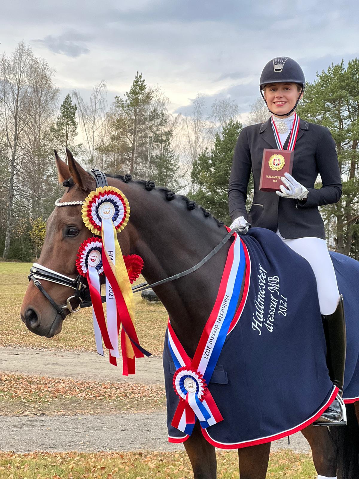 -Jeg er opptatt av variert trening, jeg rir mye på tur, jeg trener feltritt og sprang – vi trener mye og har det gøy. Det er ikke alle timene med dressur som gjør en helhet, men alt som gir glede. Det er viktig å bygge opp hesten helhetlig – få en positiv hest – og en positiv rytter, sier hallmesteren.