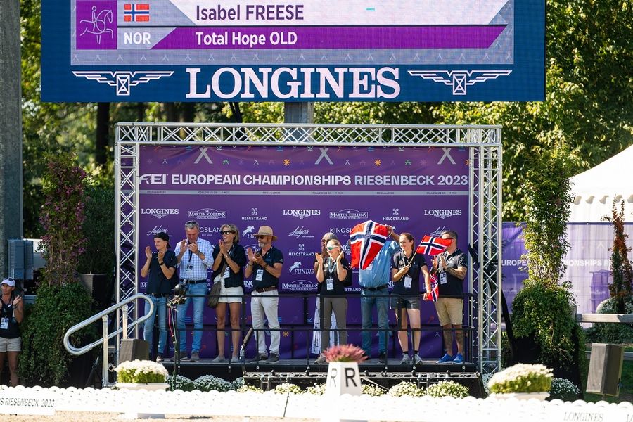 Igjen sto Isabel Freese og Total Hope for et svært godt program ved EM i Riesenbeck i dag. Innsatsen i fredagens Grand Prix Special rakk med god margin til at ekvipasjen er videre til søndagens Grand Prix Freestyle. Det er første gang i moderne tid at en norsk ekvipasje har gått hele veien til denne klassen i et EM på seniornivå. – Det er så imponerende det Isabel og Total Hope nå presterer i EM, dette er stort for norsk ryttersport, sier Nina Johnsen, sportssjef i Norges Rytterforbund.