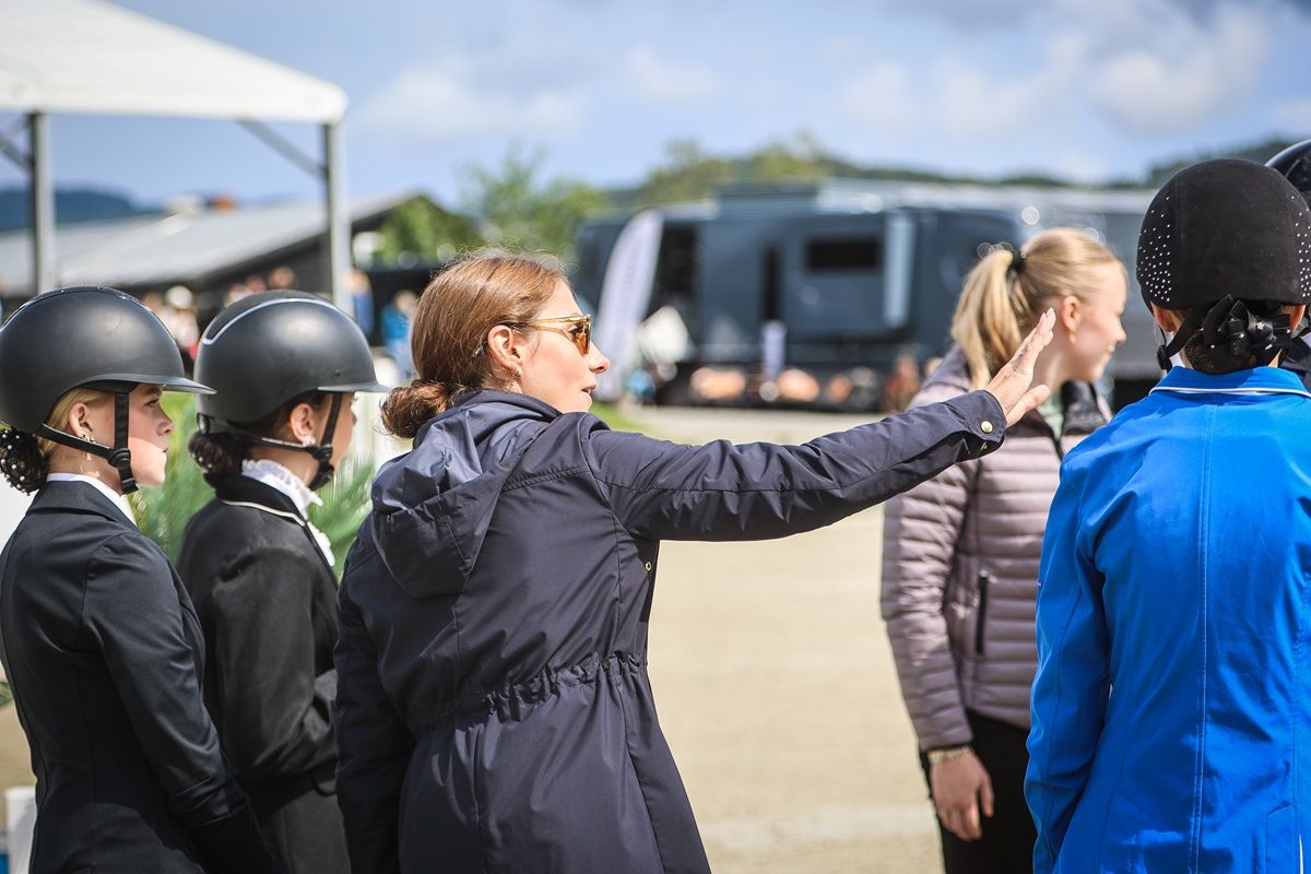 Konkurransen begynte på beste mulige måte - to av topprytterne som var med på å sikre Norges andreplass i Longines FEI Nations Cup Gjelsten Arena lørdag - en andreplass som også innebar regionsseier - stilte opp og gikk banen sammen med de unge rideskolerytterne. Johan-Sebastian Gulliksen og Oda Charlotte Lyngvær delte på sin kunnskap og erfaring og forklarte dem om den gode planen for banen de møtte på.