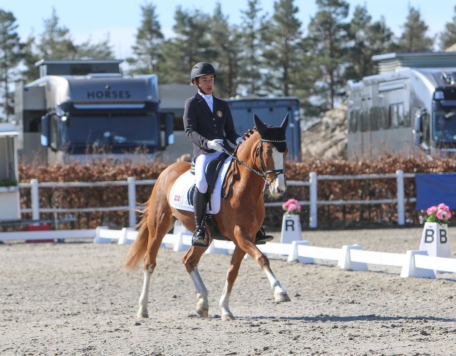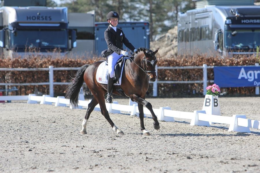 - Jeg har vært heldig med å være i trygge og gode treningsopplegg, først hos Jonas Elvebakk da jeg red ponni og nå hos Tine Øye som junior. Begge to har støttet min interesse for dressurridning og hatt inspirerende og målrettede treninger. Jeg samarbeider også godt med moren min som også er engasjert, Hun er til stor hjelp i hverdagen og på stevner.
