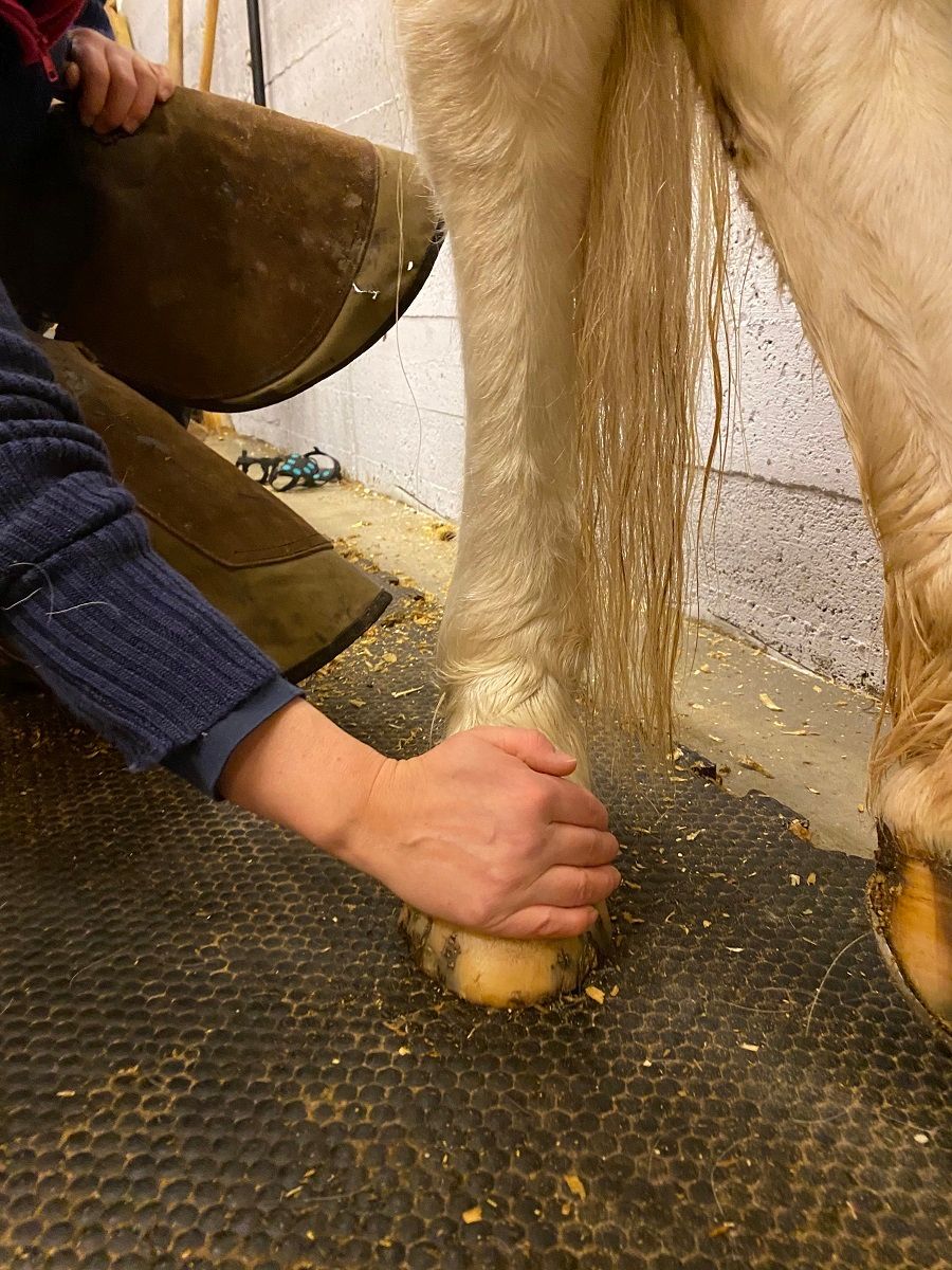 Det kan se lett ut når hovslageren tar av sko og jobber med høvene, men det kan være farlig og krever mye trening. Hvis du må ta av sko, skifte bandasje eller behandle andre skader på beina, er det viktig å være forsiktig og alltid ha med hjelp. IKKE forsøk å gjør noe som helst uten først å ha snakket med veterinær og hovslager. Noen ganger er det beste bare å tape/bandasjere hoven og la hesten stå inne til du får fatt hjelp. Husk alltid å først og fremst kontakte veterinæren hvis hesten din er halt.