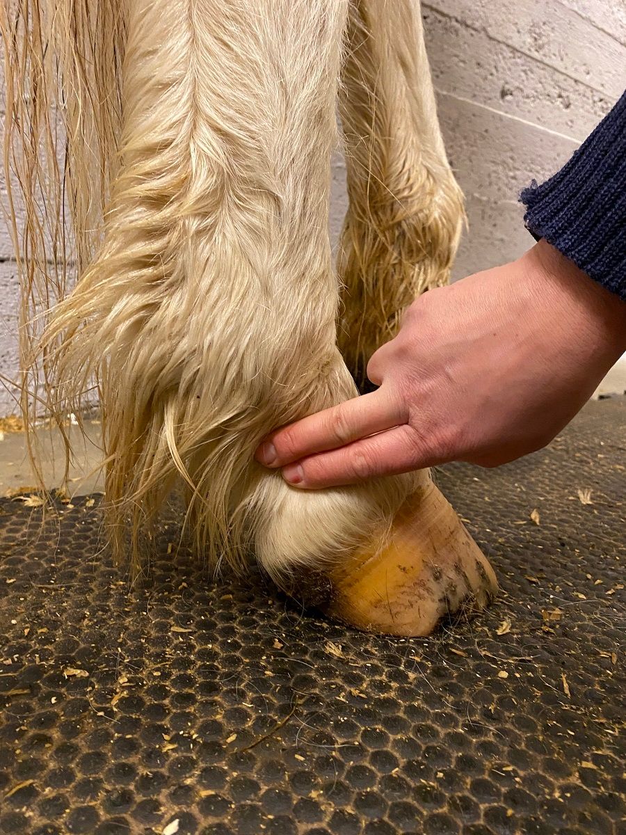 Kjenn etter varme i beinet og hoven. Er én hov varmere en, de andre, så kan dette være et tegn på skade. Det kan være vanskelig å kjenne dette, så vær sikker på at hesten har stått tørt og på et underlag som ikke påvirker temperaturen i hoven.