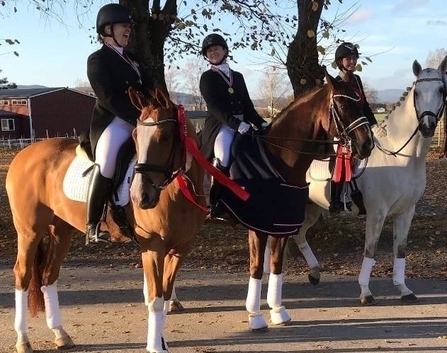 Gullet i hallmesterskapet dressur VA gikk til Therese Bragstad– like glade medaljevinnere var Mona Mangseth og Anniken Eide.