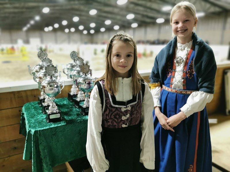 To jenter som også gledet seg stort over opplevelsene under årets innendørsmesterskap, var blomsterpikene Matilde og Lea Nora fra arrangørklubben, Grenland Ryttersportsklubb. Og spesielt stas var det selvsagt å hjelpe til under de tre INM-klassene, og til og med ha på bunad på en nesten vanlig søndag.