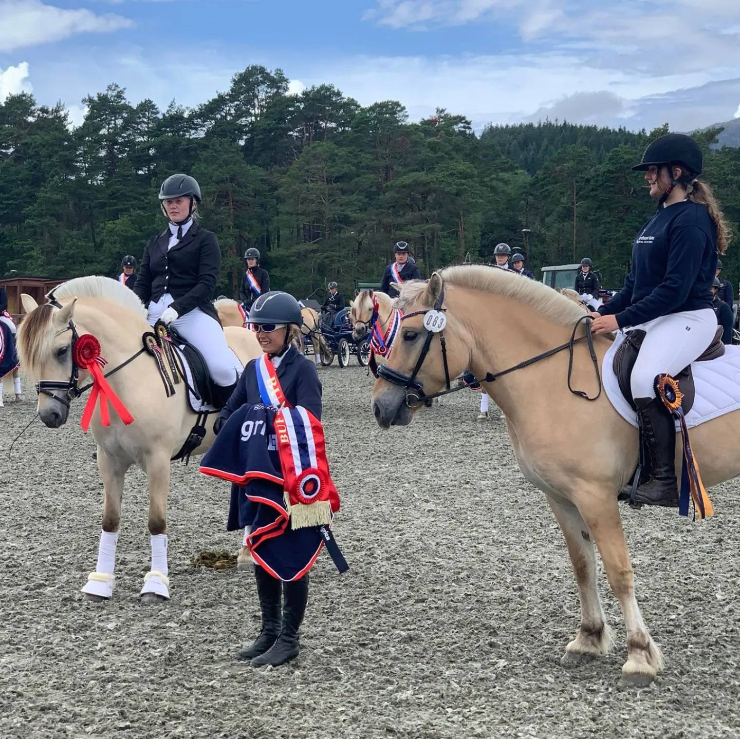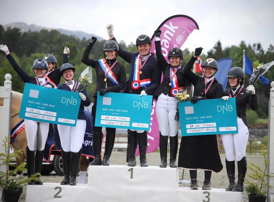 Gullvinnere NM lag: Annike Josefine Mikkelsen/Blåtopps Aron, Aina Benedicte Huseby/Blåtopps Aria og Håkon Johannes Gudjunsson/Nattens Dumle fra Råde og Onsøy Rideklubb