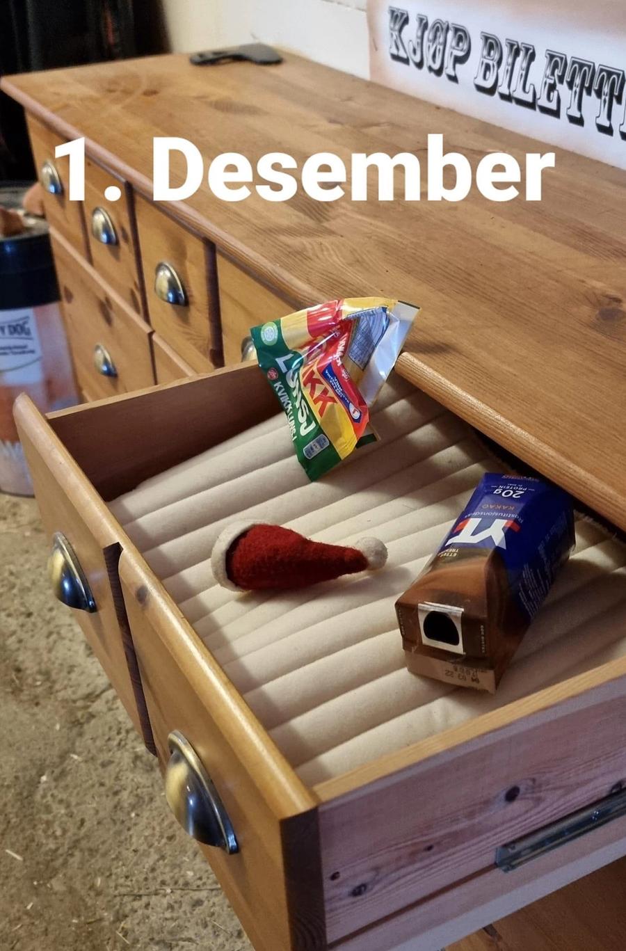 -Det startet 1. desember, forteller Anne Svenkerud Bjørgo. – Da begynte Nisse-Vidar å romstere hos oss. Først spiste han opp en Kvikk-lunsj som vi hadde liggende i stallen, og han drakk en hel kartong med Yt også. Det kunne se ut som om han ikke klarte det så godt uten å søle, for 2. desember fant vi masse nisse-tøy til tørk på en snor i vaskerommet i stallen.