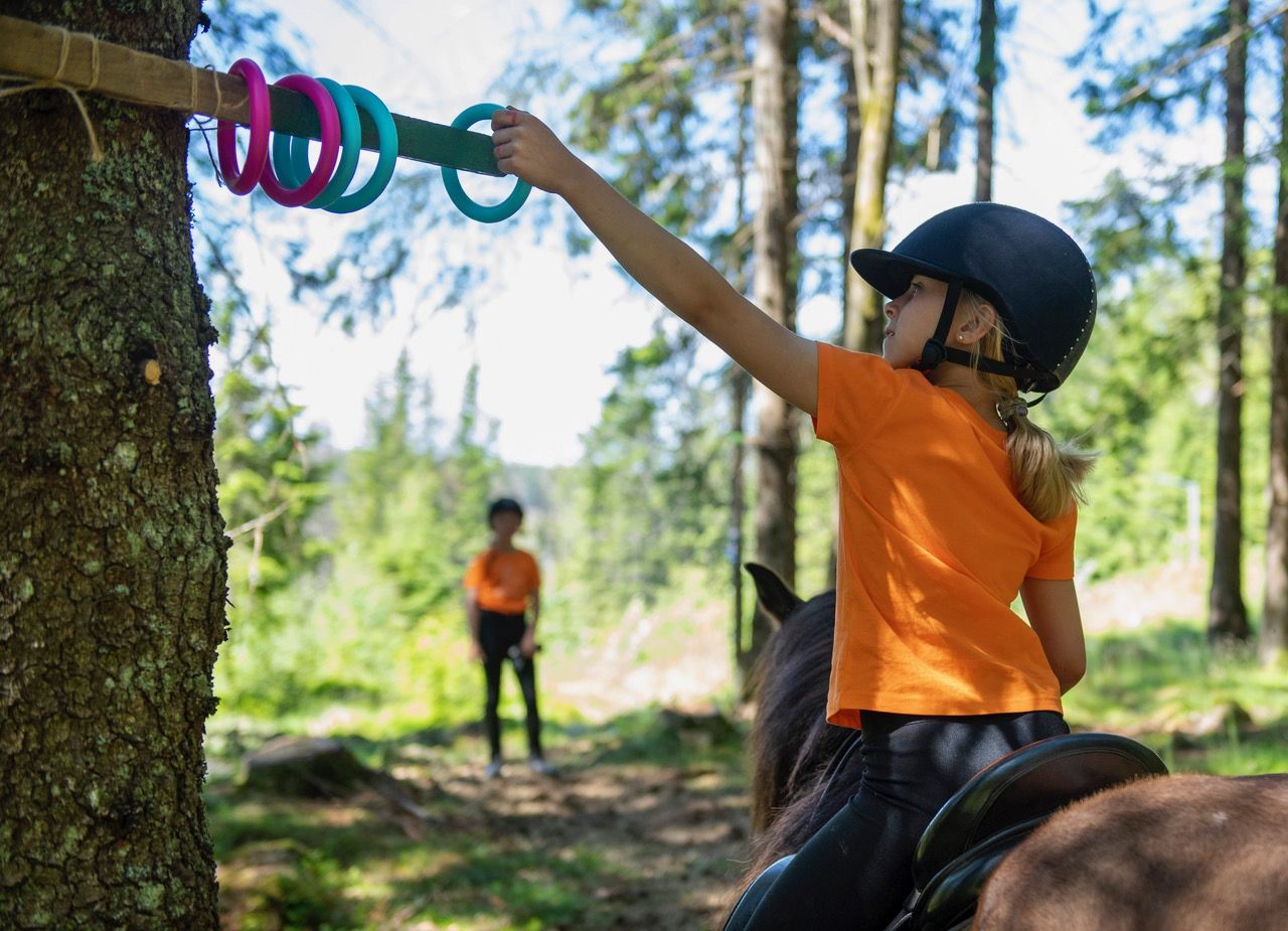 Det yrer av liv på tunet når leirdeltakerne fra seks til 13 år gjør seg klar for dagens aktivitet – gymkhana, eller lek til hest. Deltakerne er delt i fem grupper, og konkurransen starter på en hogstplass litt ovenfor gården. Løypa de skal ri starter med forsering av en port, videre overbommer på en ridebane og over en skogsbilvei. På stien gjennom skogen må de svare på spørsmål, flytte ringer som henger i trær, sitte i riktig sits opp en bratt bakke og hoppe over en stokk. Lek og læring hånd i hånd mens sola skinner fra skyfri himmel over askerlandet.