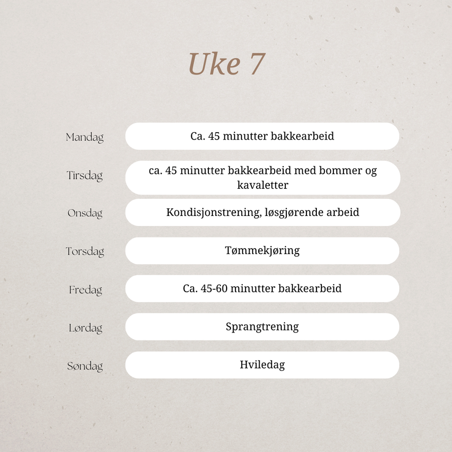 Årstiden gir mange muligheter, selv om man ikke nødvendigvis kan krysse av for at alle er like komfortable for rytteren. -Bruk mulighetene, bruk naturen, også om vinteren, lyder det fra treneren. - Bakkearbeid behøver slett ikke gjøres på en ridebane eller i et ridehus for at man skal få utbytte av det – tvert imot gir det mange fordeler å legge den til naturen rundt deg.