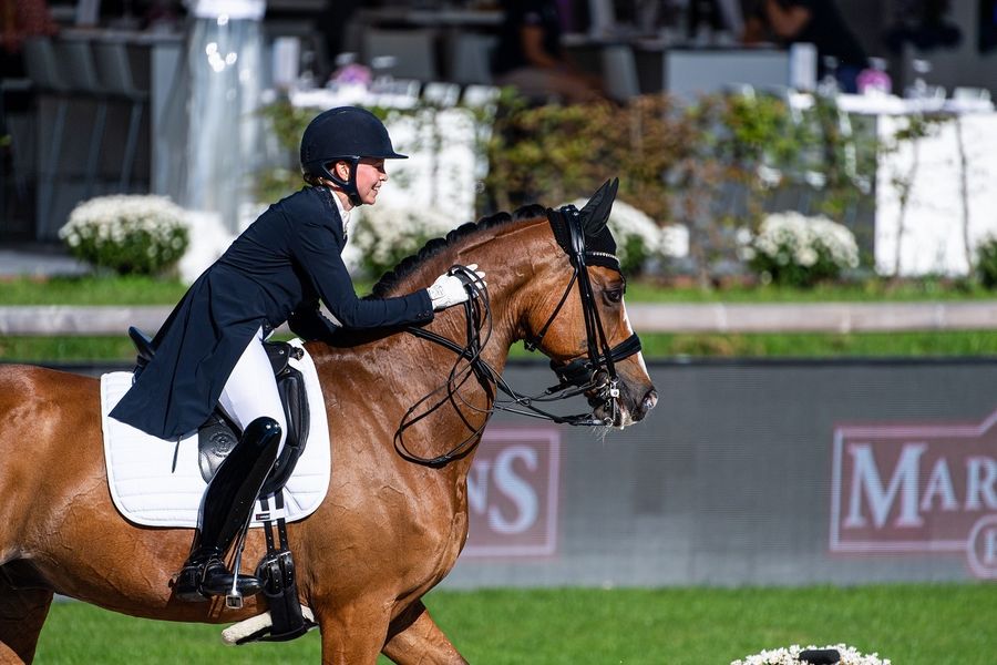 Rytteren var fornøyd med saksen – og hun sier seg også fornøyd med seriene, noe hun har all grunn til å være. Både ener- og toerserien ble utført helt feilfritt, av en hest i en fin form, i god og luftig oppoverbakke, gode bakben – de var uttrykksfulle og gode. – Jeg er fornøyd med seriene, og fornøyd med at det ikke kom noen feil der, det kan det fort bli når hesten er spent, sier Mathilde.