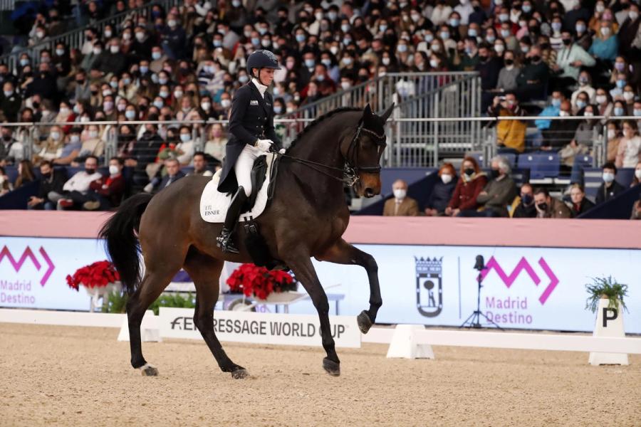 Helene var siste rytter ut av 12, og presset var så absolutt der. Men sammen viste de et overbevisende program, belønnet med 80,500 % - og det holdt til seier foran en hjemmefavoritt, Beatriz Ferrer-Salat som med sin 12 år gamle hoppe Elegance e. Negro/Monaco fikk 79,220 %. Hele fem spanske ryttere deltok i küren foran et entusiastisk publikum, som jublet over ikke bare andreplass men også tredjeplass i klassen. Det var dere 24 år gamle stjernerytter Juan Matute Guimon som sin 15 år gamle vallak Quantico e. Fighting Fit/Constant tok denne topplasseringen med 78,160 %. Applausen han fikk rommet mye – denne talentfulle rytteren er allerede en legende etter at han har kommet seg tilbake til sporten igjen etter en dramatisk hjerneblødning i mai 2020.