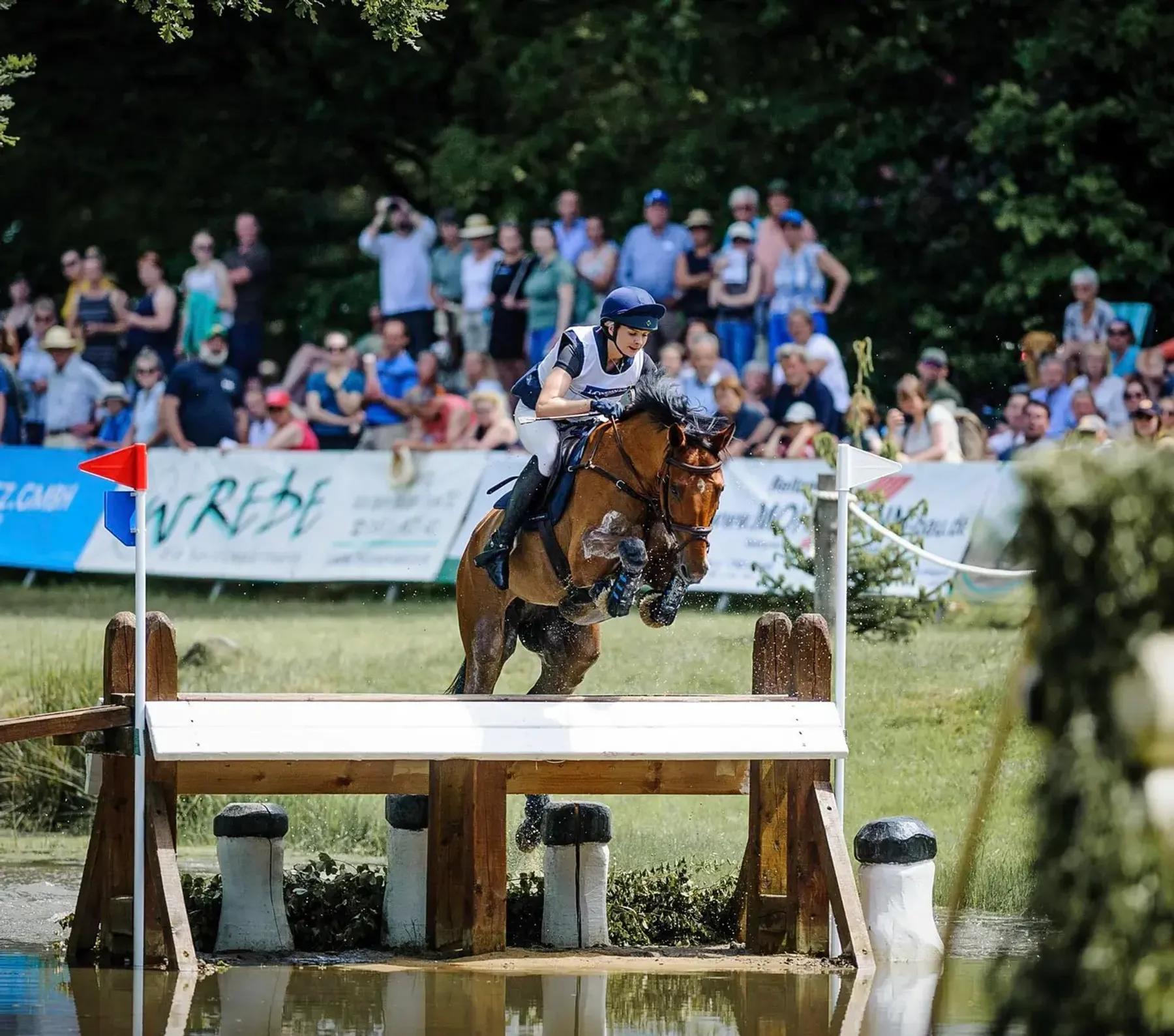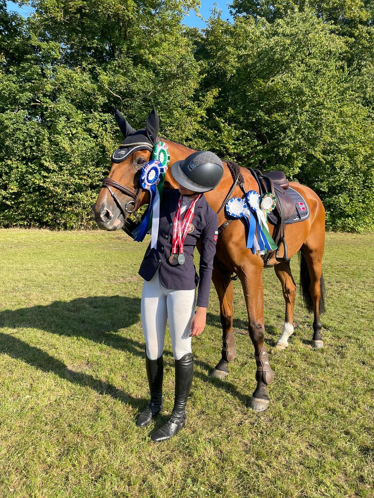 Sprangen gikk der hvor dressuren gikk – i Bernstorffsparken. – Det er en lang og stor bane på gress i en park, og det er mye å se på! Chillo er ganske stabil i hoppningen, men det er klart at man har ganske mye press på seg når det går siste dagen og man ligger an til topplassering. Jeg gikk banen to ganger og planla rideveier til alle linjer nøye. Vi var nest sist inn, siden man snur startrekkefølgen for spenningens skyld – derfor rakk jeg også å se noen først. Det var mye feil, så jeg visste at dette måtte ris ordentlig. Og det gjorde vi! Jeg begynte faktisk å gråte da jeg kom ut av banen og alle var så glade for oss – jeg hadde virkelig ikke trodd at det skulle bli som det ble dette mesterskapet – og da betyr det ekstra mye når det går så bra!
