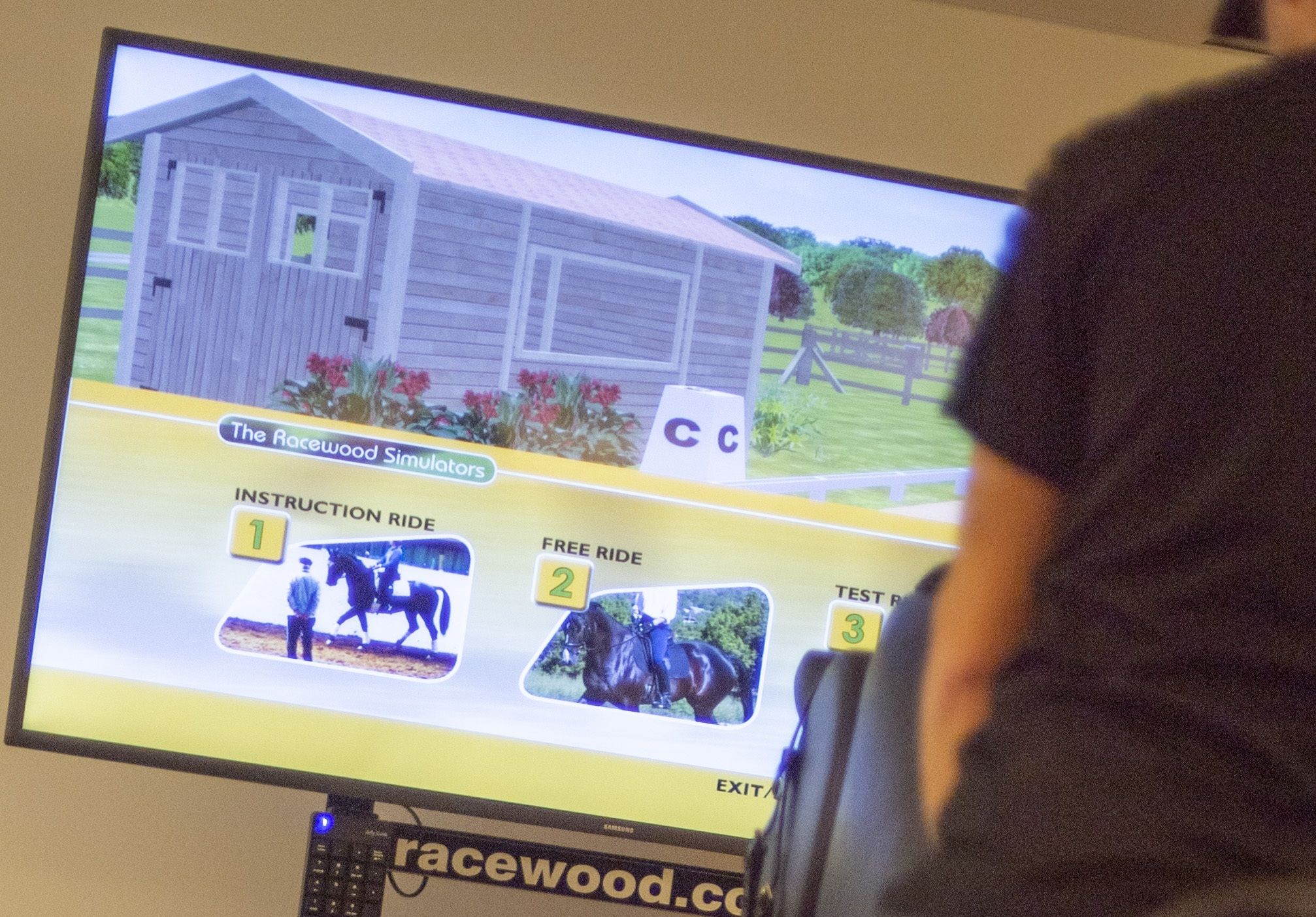 Det er for fristende. Jeg kan ikke la sjansen gå fra meg, og takker ja til «en ridetur i skogen». Magnus holder i salen på motsatt side når jeg stiger opp i salen. Jeg legger sjenkelen til og kjenner de rytmiske galoppslagene under meg. Skjermbildet på veggen tar meg med inn i grønne skoger, rundt vann og mellom trær, mens fuglene kvitrer og sola skinner. Jeg retter meg opp følger Magnus´instruksjoner, og Ruusulv går fra galopp til trav. Magnus står ved siden av og instruerer samtidig som et bilde på skjermen registrerer bruken av hjelperne.