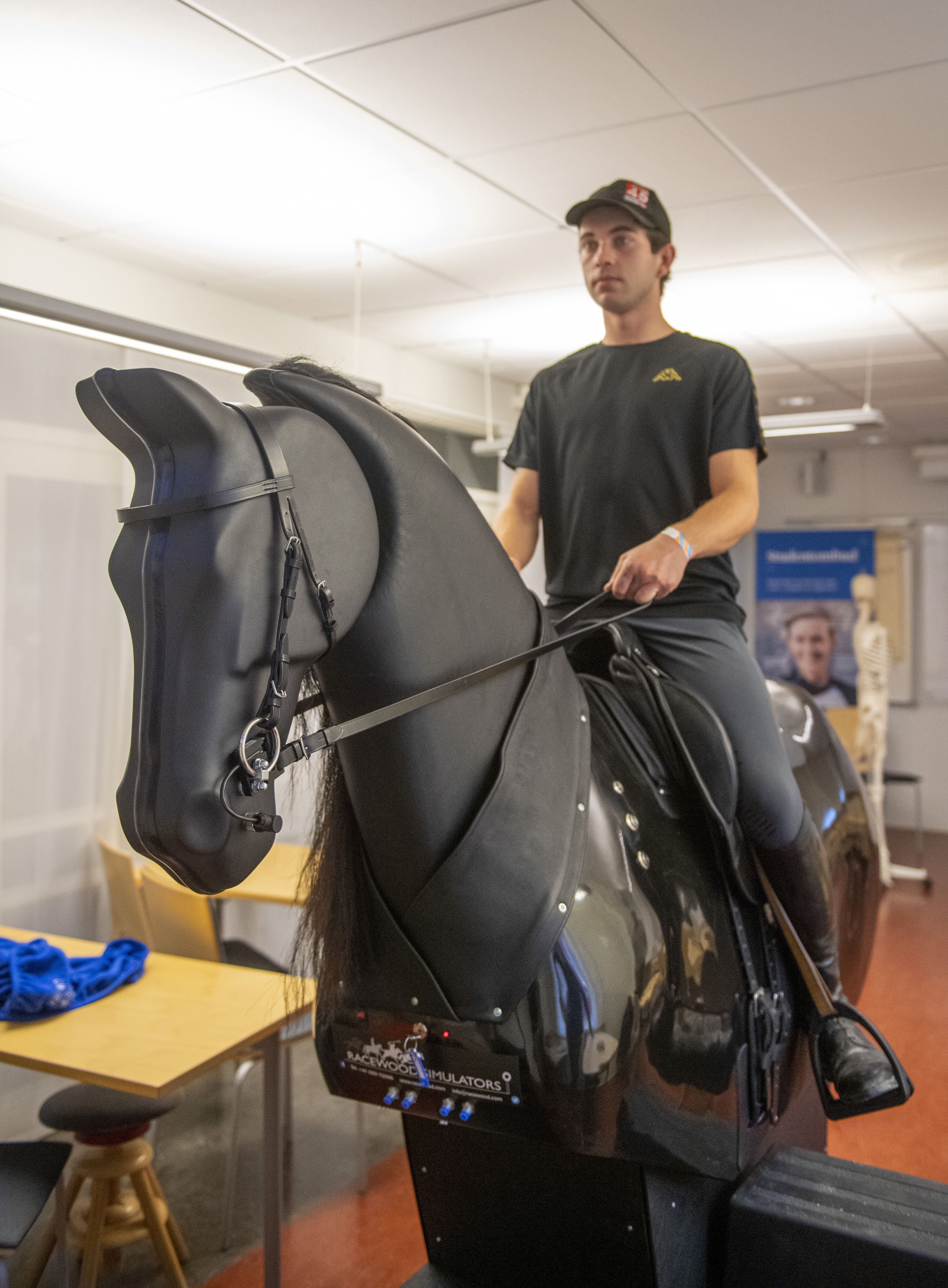 Magnus Sæther er andreårs student ved ridelærerutdanningen på Starum. Han liker godt den mekaniske hesten Ruusulv, et populært tilskudd til i ridelærerundervisningen ved Norsk Hestesenter.