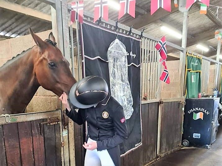 - Nå er vi på vei hjem etter europamesterskapet i Hartpury. Jeg er veldig fornøyd med Springy, han har virkelig jobbet i helgen! Han startet med en ganske fin dressur, etterfulgt av en kanon runde i terrenget. Dessverre gjorde jeg et litt dårlig valg mot slutten av banen, noe som kostet oss dyrt. På søndag hoppet han en feilfri og fin sprangrunde. Dette har vært en stor opplevelse, og jeg håper virkelig at dette er noe man får oppleve igjen, avslutter hun smilende.