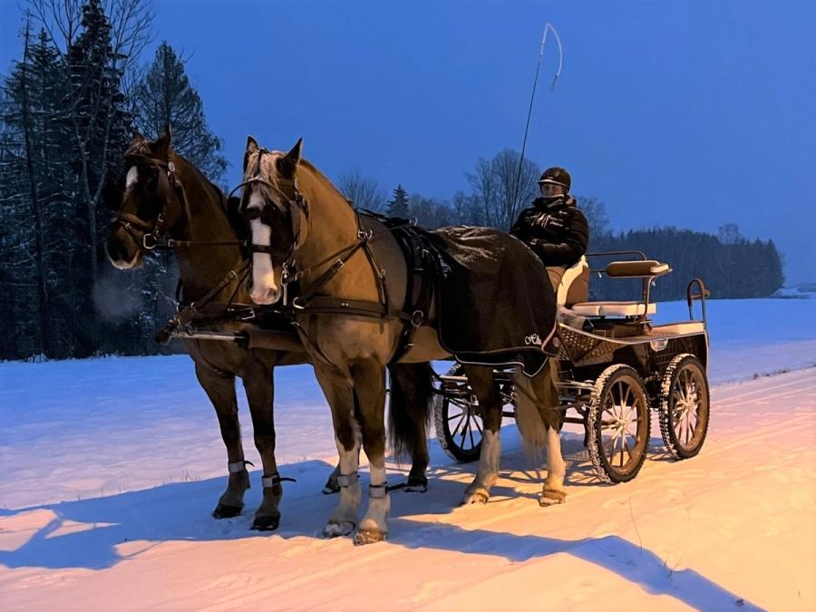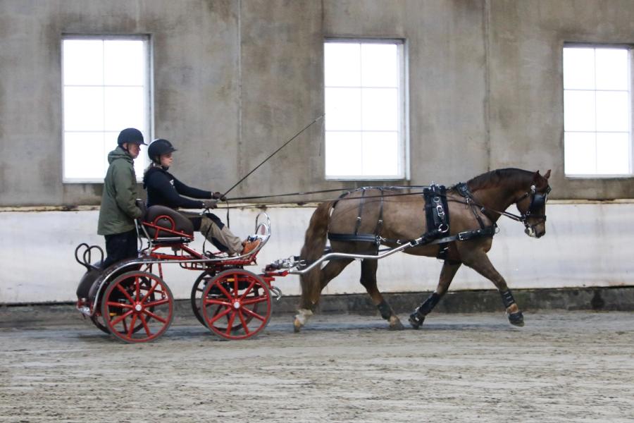 -Vi trener for det meste på tur, og en til to dager i uken på banen. Selv rir jeg dem mye på tur, og søsteren min, som er dressurrytter, hjelper til med å ri dem i dressur. Det styrker dem mye i dressuren i kjøring også.