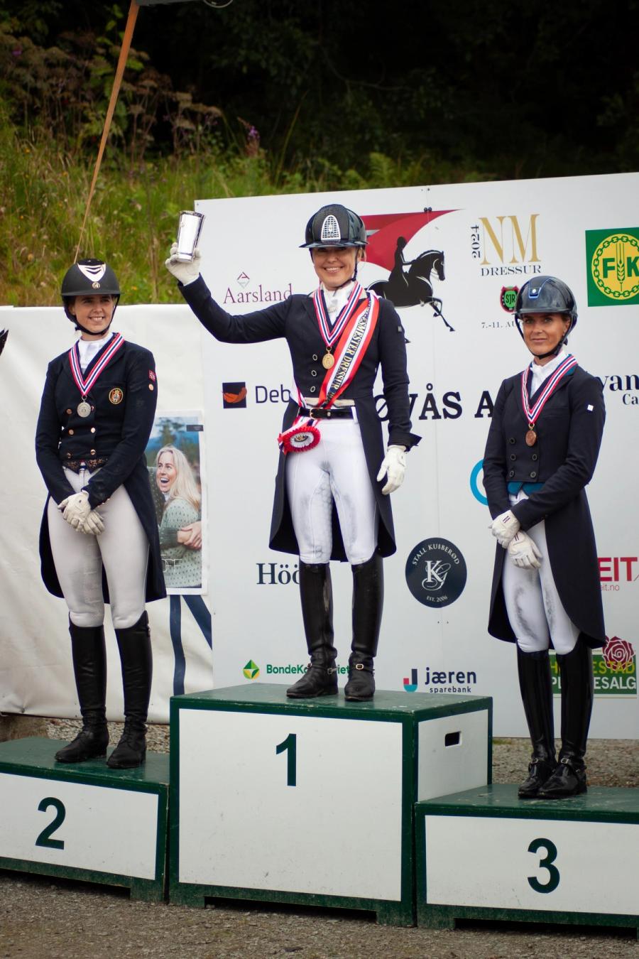 Oda Helen Finnanger, Christina Marcussen og Cathrine Rasmussen er ferske norgesmestere i dressur. I morgen skal ytterligere fire ryttere få klatre øverst på pallen, fulgt av sølv- og bronsevinnere.