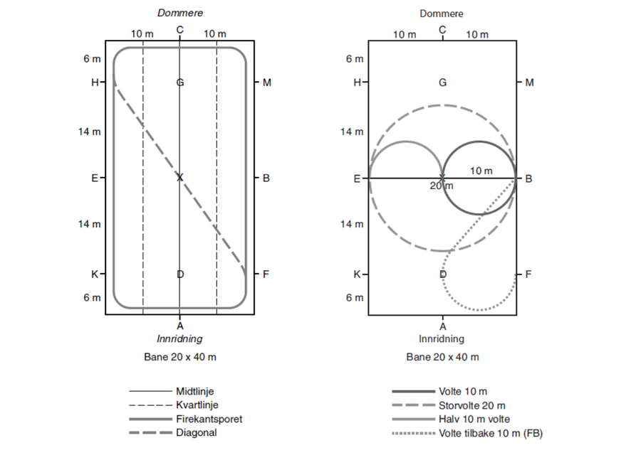 a) Volte er en sirkel med diameter som oppgitt i det enkelte tilfelle. b) En serpentine ut til langsidene består av halvsirkler forbundet med rette linjer vinkelrett på midtlinjen. Lengden av de rette forbindelseslinjene varierer avhengig av størrelsen på halvsirklene. Rytteren begynner den første buen ved gradvis å fjerne seg fra kortsiden og avslutter den siste buen ved gradvis å nærme seg den motsatte kortsiden. Å starte eller avslutte i et hjørne er ukorrekt. I serpentine med én bue langs langsiden av banen skal buen gå 5 eller 10 meter inn fra sporet. I serpentine langs midtlinjen skal buene gå 5 meter ut fra midtlinjen. c) En åttetallsvolte består av to like store sirkler med diameter som oppgitt i det enkelte tilfelle, forbundet med hverandre i åttetallets sentrum. Hesten rettstilles et øyeblikk i overgangen fra den ene til den andre volten.