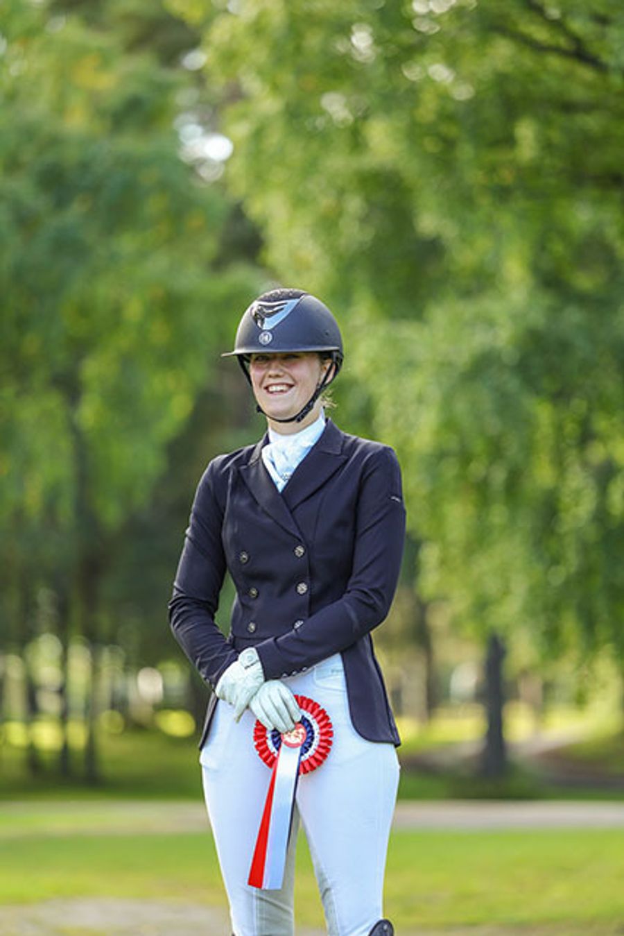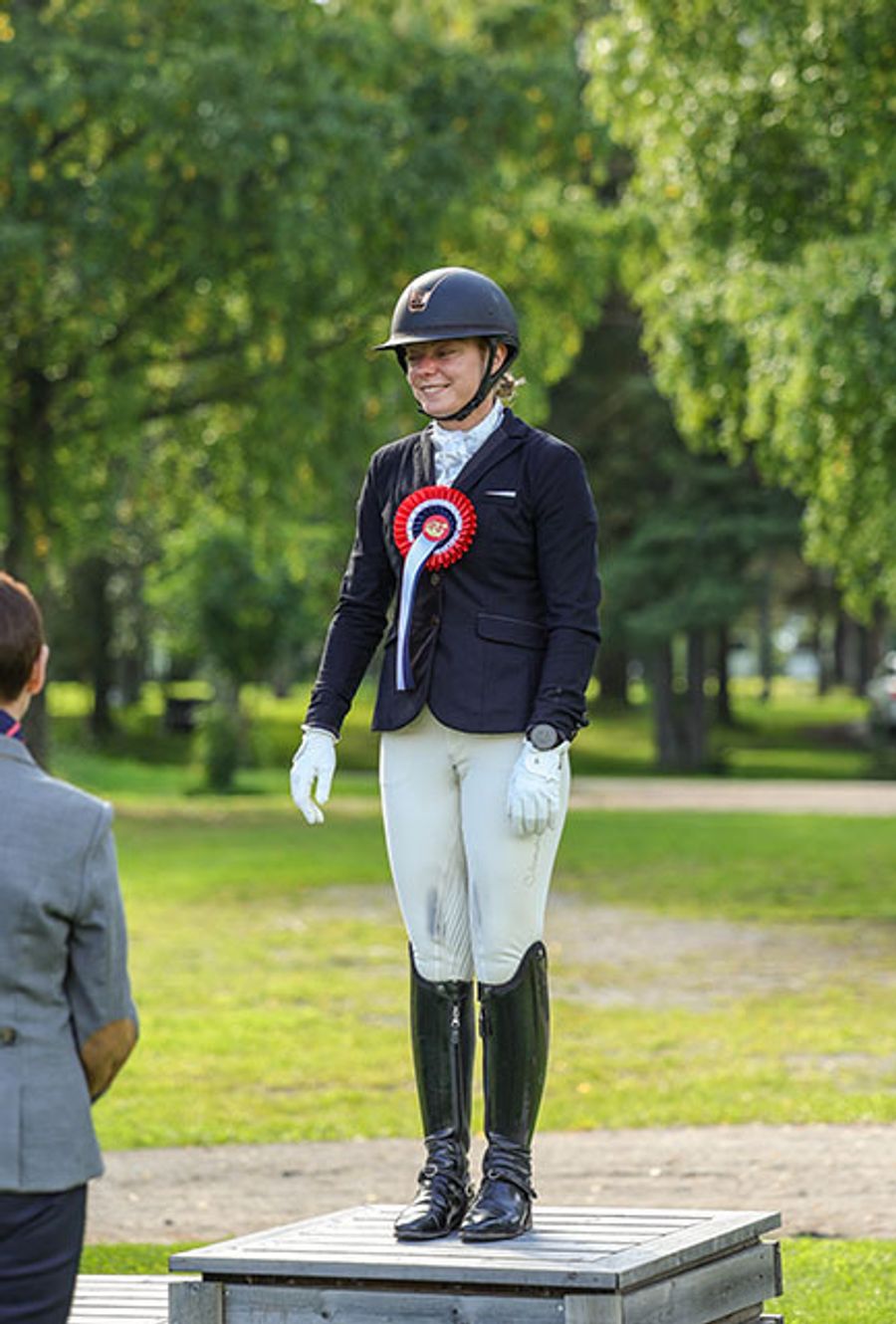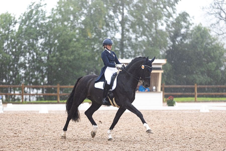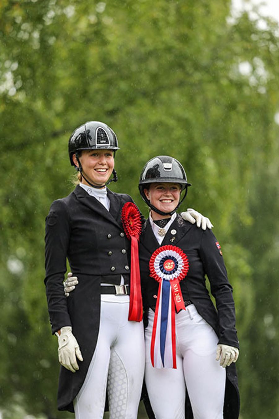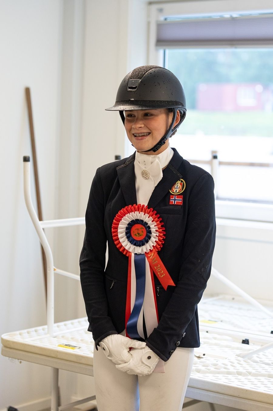 I fredagens noe våte vær var det ikke så uventet årets nordiske mester for juniorer som toppet resultatlisten i denne alderskategorien. Emma Løkken/Mr. Gold G (Milan/Lobster, oppdretter Gitte L. Andersen) er vant til all slags vær i Oppdal og Emma red sin hingst sikkert rundt til et prosentresultat på 73,324. Dermed ligger ekvipasjen fra Oppdal Hestesportsklubb klart i tet i en klasse som er gledelig stor med sine 17 startende. Sondre Torp Kristiansen/Thybo’s Laban (L’Espoir/Michellino, oppdretter Djon Thybo) fra Solberg Rytterklubb vant den røde sløyfen på første stevnedag, en liten millimeter foran Thia Elise Nielsen/Ophelia van het Rozenhof (Johnson (ex Verdi V/Ferro, oppdretter Jean-Pierre Parez) fra Skedsmo Rideklubb.