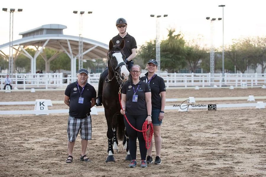 Denne viljen til å hjelpe hverandre er noe som karakteriserer paradressur-miljøet, men den finnes så absolutt ellers også. Det fikk Jens Lasse, Aladdin og Mette kjenne på en gang de var til det internasjonale CPEDI3*-stevnet i Doha – Det var vel første gangen vi var der, da hadde vi ikke noen companion horse sånn umiddelbart, tidsskjemaet gjorde det litt vanskelig å organisere med en hest fra para-miljøet.