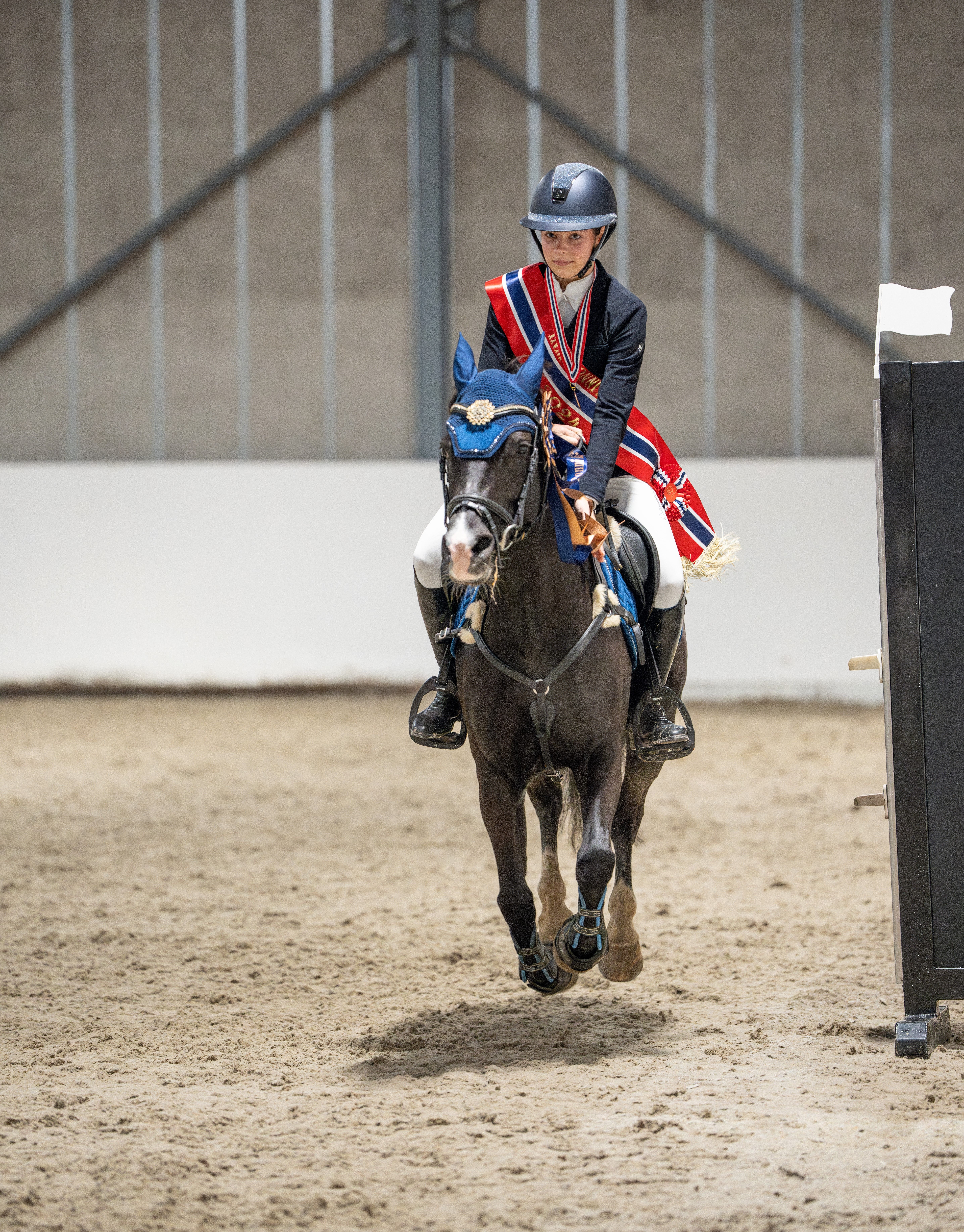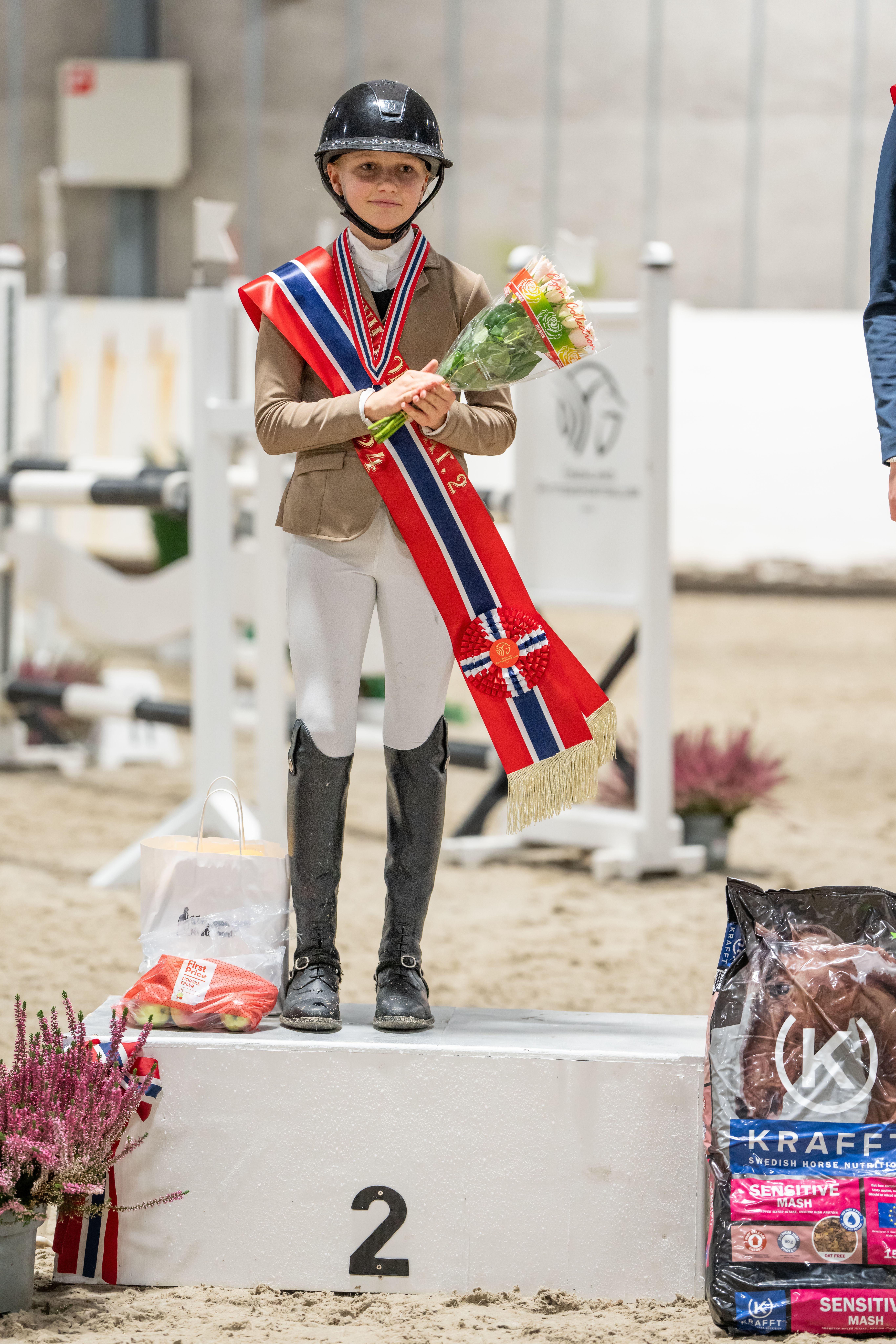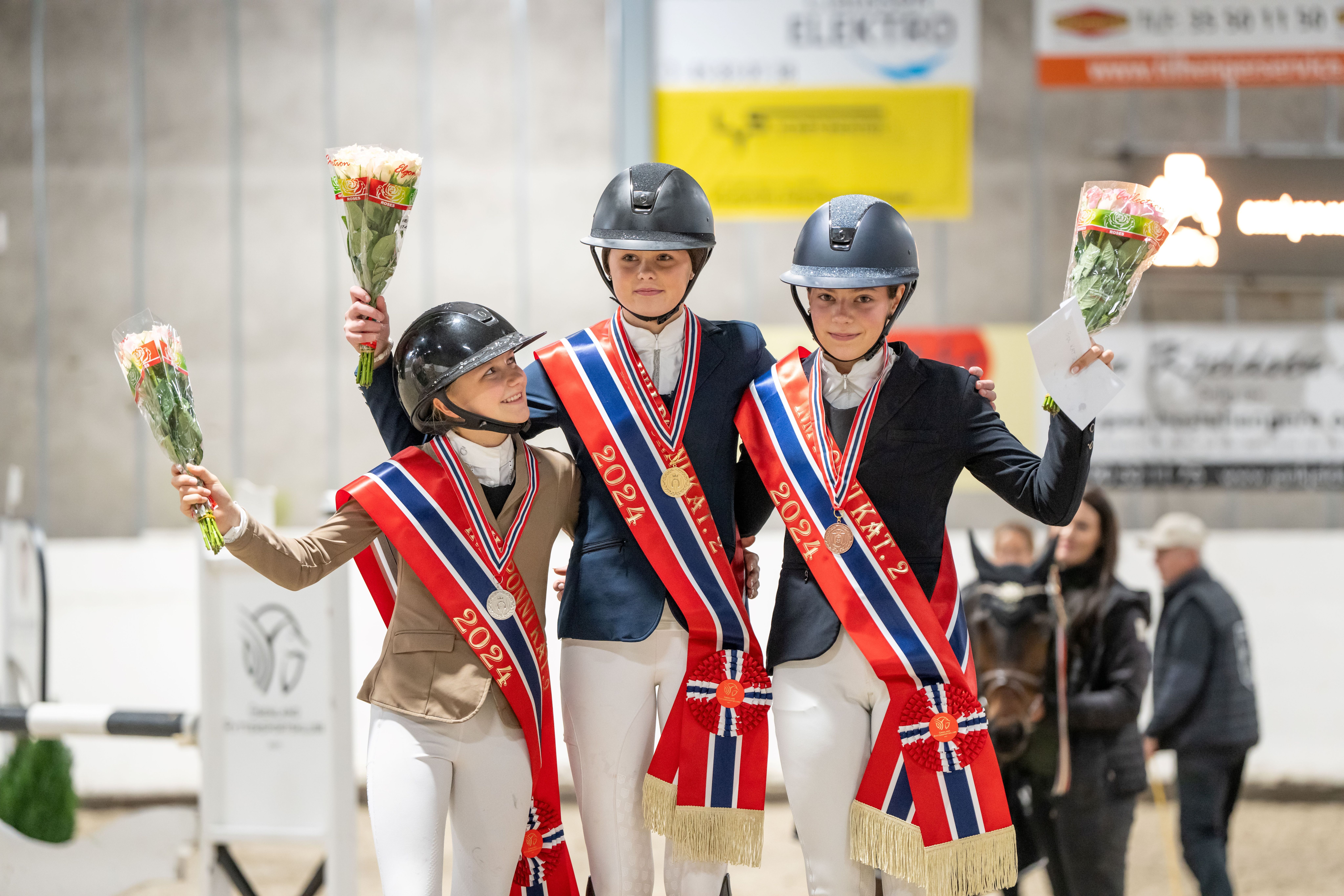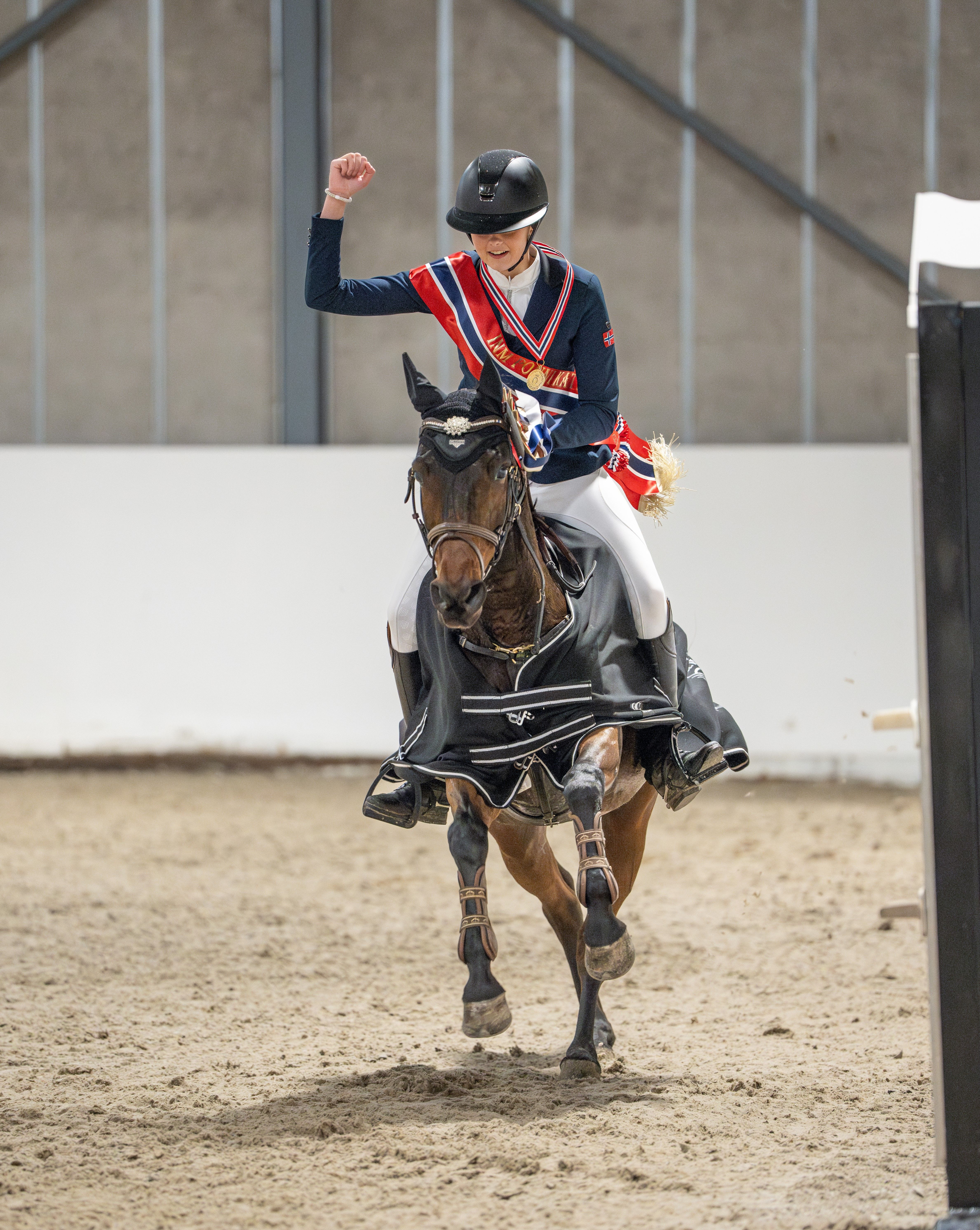 Arendal og Grimstad Rideklubbs Jenny Mathilde Friland og Miss Sassy som hadde med seg fire feil fra 1. omgang, greidde seg imidlertid med dette og vant derfor årets INM-gull for ponni kategori 1 - etter å ha sikret bronse i NM på hjemmebane tidligere i høst. Arendalsduoen er for øvrig også ekvipasjen som nylig vant i stilrunden av Backe Cup på Unity Arena. Og ikke nok med det. For rytteren ble altså historisk denne helgen i Grenland, da hun etter hvert også skulle hive seg inn i medaljekampen i childenrytternes INM, og til sist sikret edelt metall også der.
