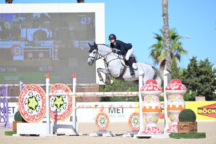Denne søndagen var Cathrine på ny ute med Just Action RV i 1,30 m og fikk en finfin syvendeplass, mens hun red Heartcor F i bronseturfinalen i 1,40 m. Duoen gikk null i grunnomgangen sammen med åtte andre, og klinket deretter til med en både feilfri og rask omhopping. Dette resulterte i en sterk andreplass i dagens finale, og den velridende 28-åringen kan dermed se tilbake på hele syv av ni plasseringer bare denne første uken under spaniaoppholdet.