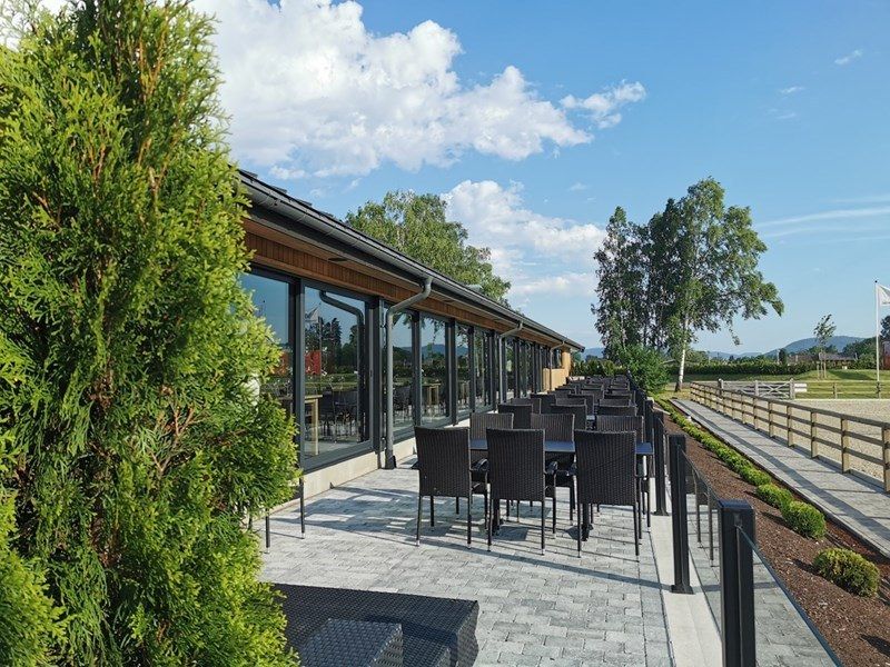 Bygget tildeles hederlig omtale fordi det overrasker positivt når det kommer til materialbruk, utforming og stedstilpasning. Bygget ligger mellom to ridebaner og knytter disse sammen. Med store vindusflater i form av skyvedører ut mot begge sider og det at bygget også er hevet noe opp, gir dette optimalt utsyn til begge banene fra kafedelen.