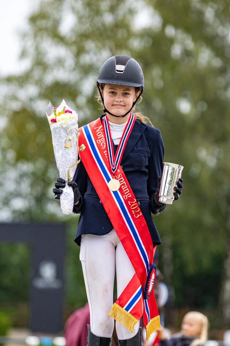Søndag red Sofie Bjerkan Knoff fra Tønsberg og Omegn Rideklubb inn NM-gullet i klassen for ponni kategori 2. For Sofie betød det gull i dobbelt forstand – for hennes ponni er som gull for henne også. – Ord kan ikke beskrive hvor glad jeg er i henne!
