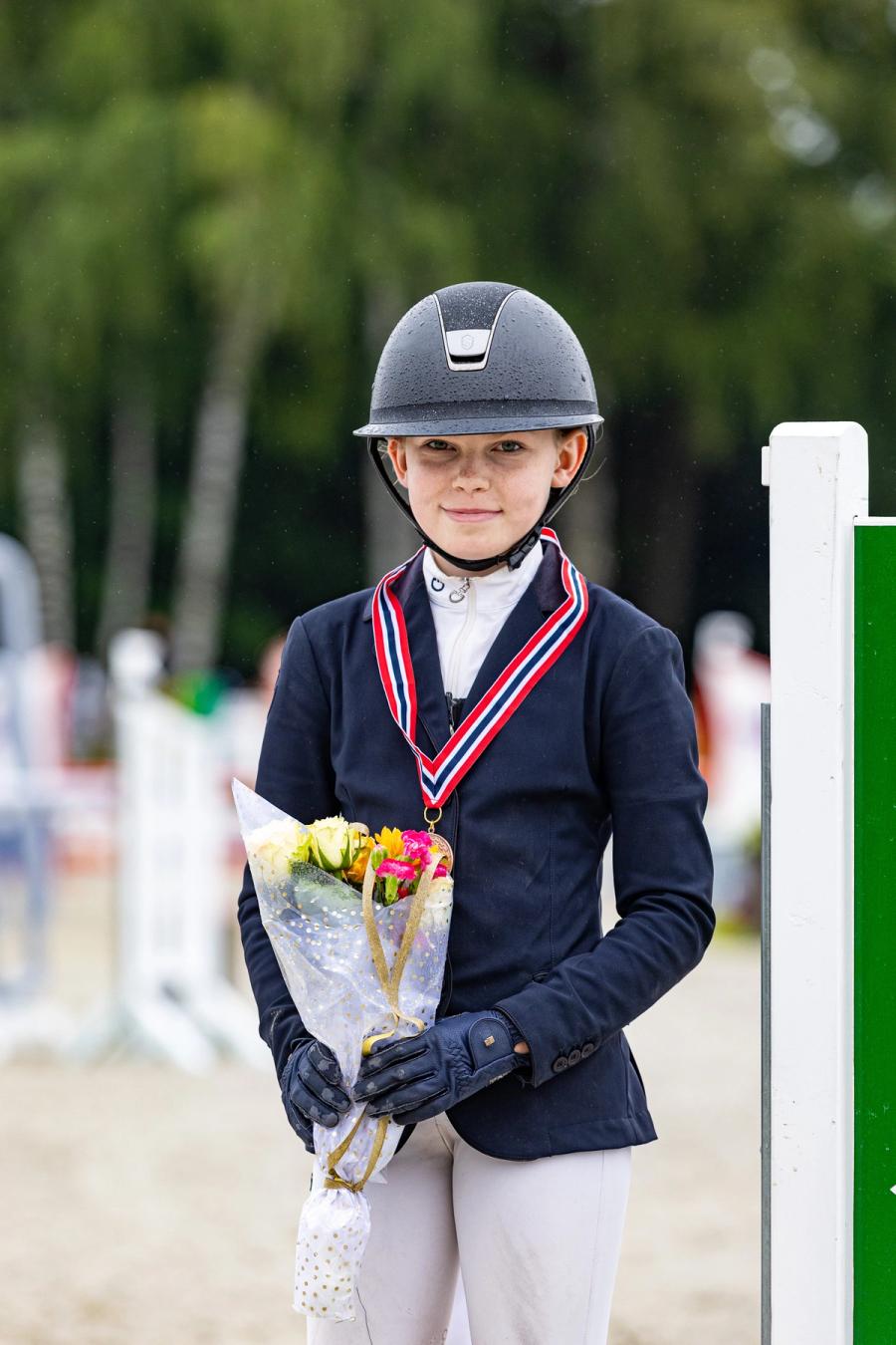 Tre ekvipasjer måtte ut i omhopping om bronsen. Som siste rytter ut sikret Ella Homme Claussen/Kantje’s Wilson (Marits Misique/Duke’s Forest Antares) fra Grenland Ryttersportsklubb seg denne medaljen - samtlige tre fikk fire feilpoeng, men Ella var best på tid. Fjerdeplassen gikk til Marie Gulliksen U – Lisa van de Veldbalie (Konquisrador van Orchid’s) fra Asker og Omegn Rideklubb foran Olivia Riber/Surprise (Teglovnens Sebastian) fra Jarlsberg og Melsom Rideklubb.