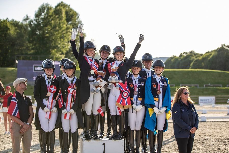 Danmark tok laggullet blant UR-rytterne med 410,588 poeng. Norge vant sølvet med 404,510 - og ekvipasjene som sanket inn dette var Anne Mathilde Reimer Haga/Treldegaards Sensasion (Blue Hors Hotline/Midt West Ibi Light), Juni Bødtker Næss/Don Don (Don Olymbrio/Don Bedo), Celine Karstensen/Don Priamos (Don Primero/Amiral) og Nora Windgaetter/Jamie’s Future (Everdale/Alexandro P). Sverige fulgte på bronseplass.