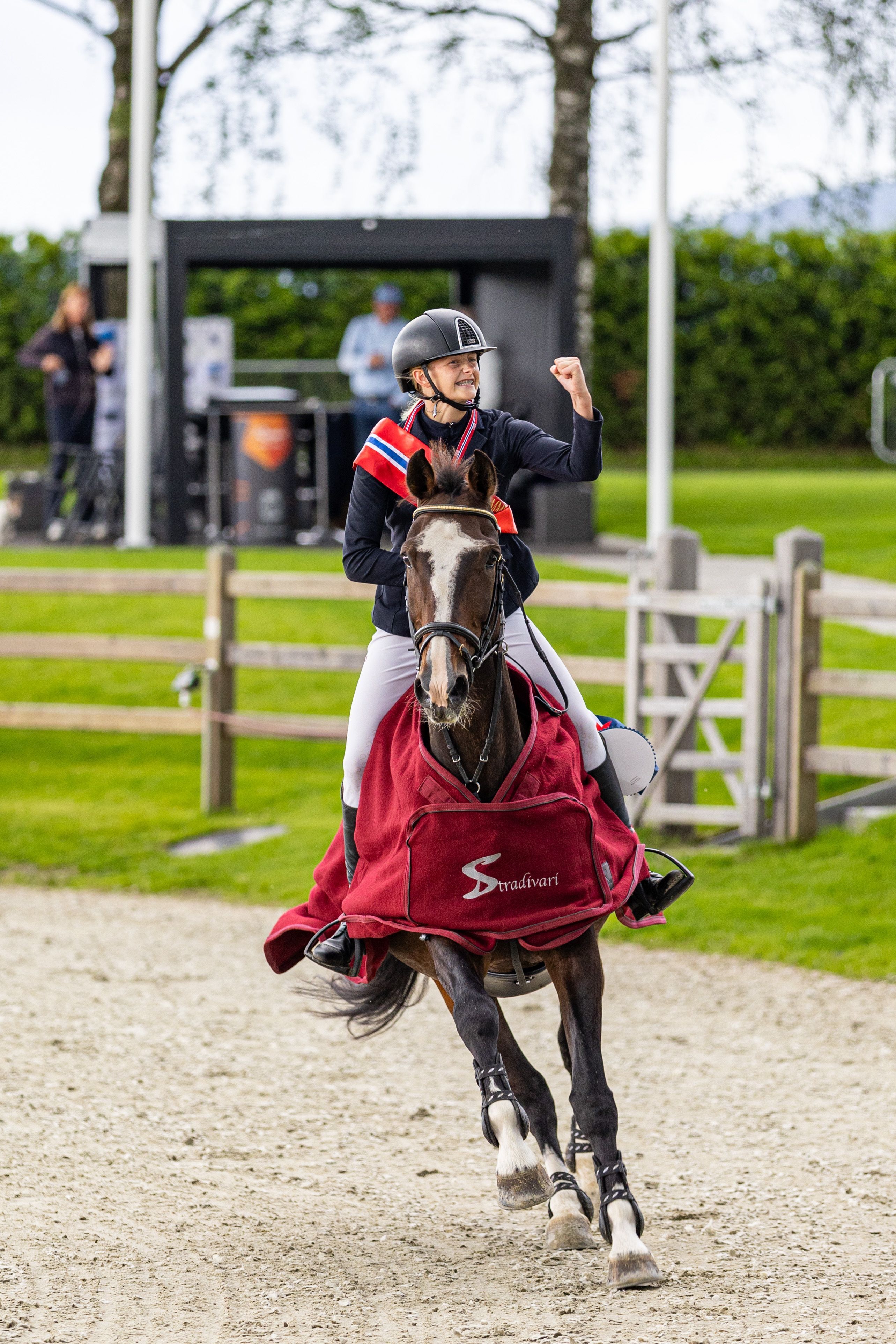 - Turen hjem til Steinkjer kommer til å gå mye raskere enn den gjorde hit til Drammen, ler den rykende ferske landmesteren i 1.10 m. - Og medaljen skal jeg henge på Agria-bamsen som jeg vant, fordi den ligner på gamleponnien min, ler 19-åringen. - Det er en skikkelig god følelse å vite at jeg er landsmester i ett helt år videre. Men det har ikke sunket helt inn at jeg vant og slo ut så mange. Lerens Pablo er en 15 år gammel vallak, og jeg har lånt ham i ett og et halvt år nå. Men det ser ut som om han blir hos meg, for jeg er blitt så glad i ham, smiler hun.