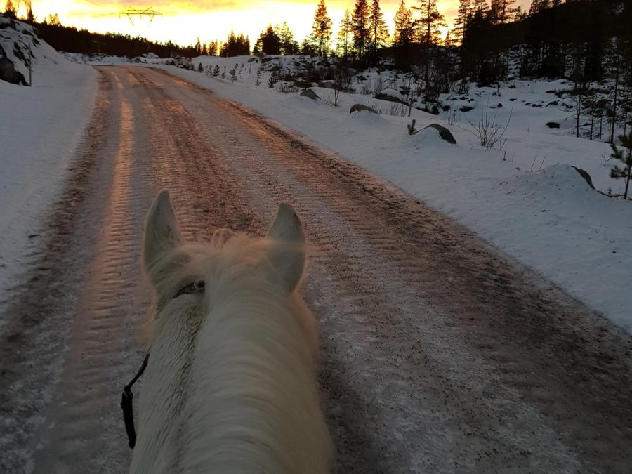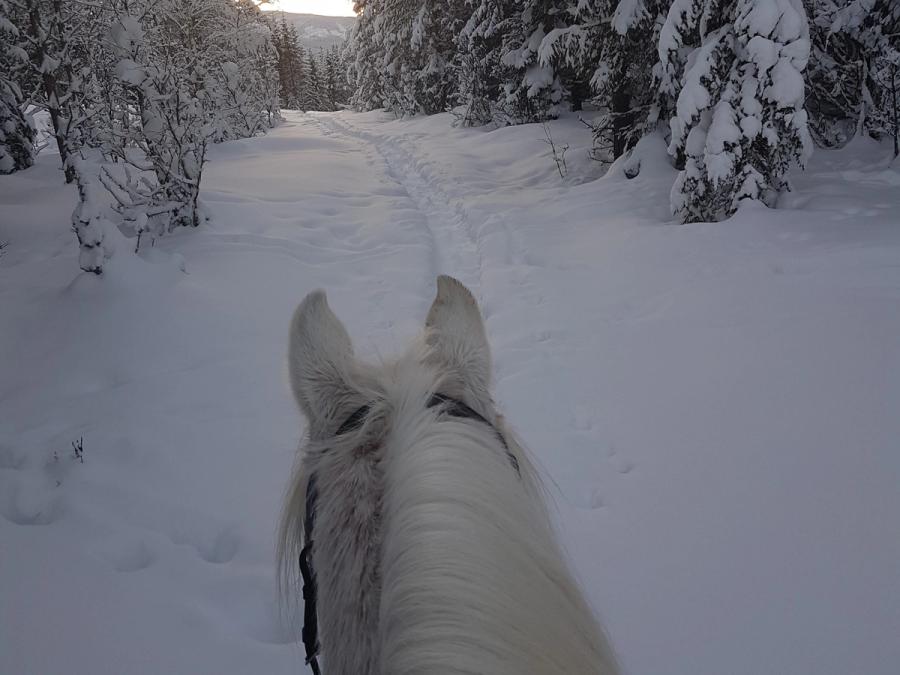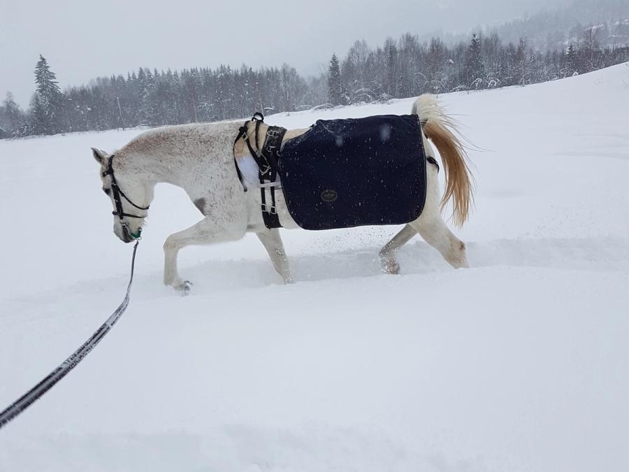 -Vi må ikke være redde for å ta med hestene ut, sier Ekra som rir i all slags vær. -Jeg storkoser meg med den første nysnøen, men er man litt kreativ på turmulighetene, og har gode brodder, så går det bra med is og barfrost. Vi har mest snøføre her om vinteren, men jeg traver på asfalt også. Hestene trenger både mykt og hardt underlag. Mine hester har bygd opp sterke sener, og er mer sårbar på mykt underlag, noe jeg kan kompensere for når vi får snø å trene i, siden vi ikke har sand eller annet lignende mykt å trene på ellers i året.