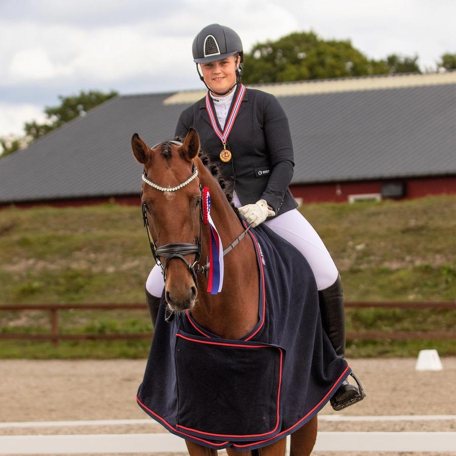 Selv har den erfarne dressurrytteren fra Halden Rideklubb utallige sportslige høydepunkter og også drøssevis av mesterskapsmedaljer å se tilbake på, og nå er altså det meritterte dressurtalentet også nyslått KM-mester i Østfold Rytterkrets med åtte år gamle Zalando.