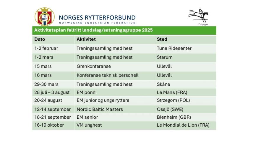 Her finner du aktivitetsplan for 2025 for landslag og satsingsgrupper i feltritt. Vi gjør oppmerksom på at endringer kan forekomme.