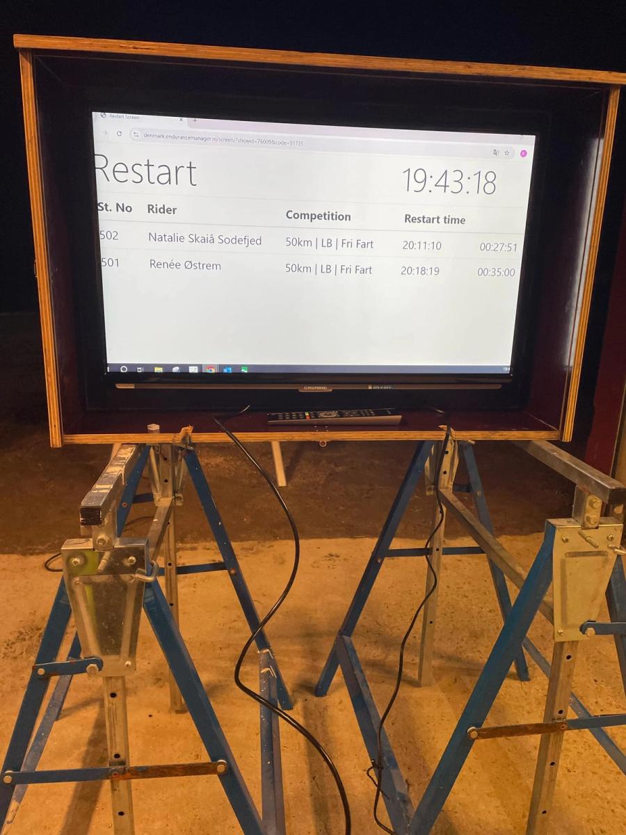 Restart skjerm er en veldig god hjelp for arrangør. Der kommer tid for start på neste etappe opp, startene kommer i riktig rekkefølge og det telles ned til start.