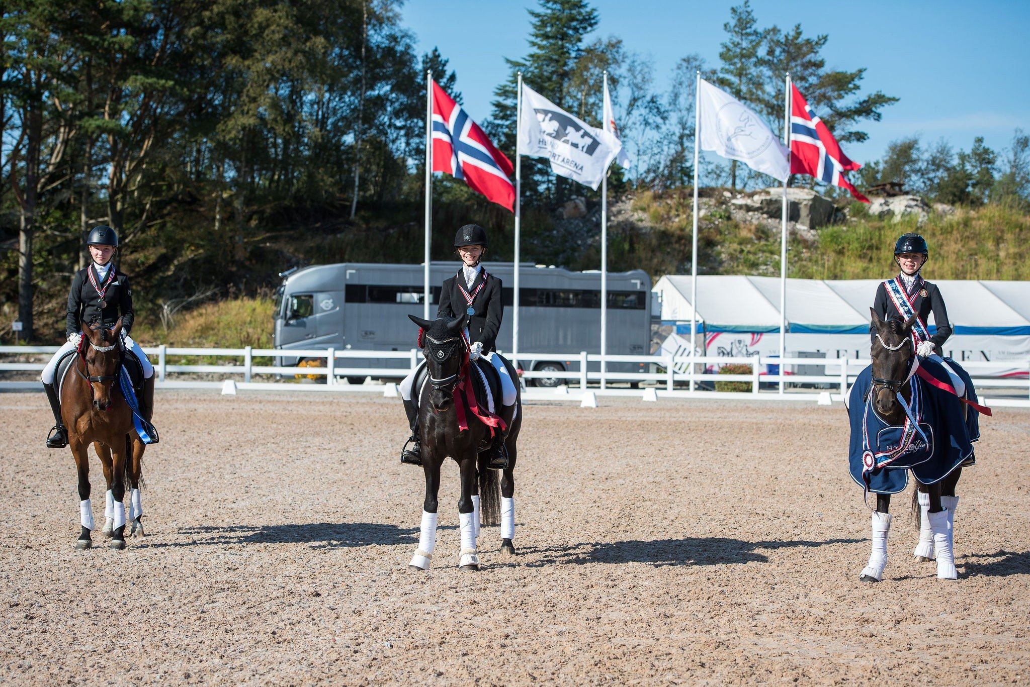 NM-feltets tolv beste juniorekvipasjer møttes til medaljekamp på Haugaland Hestesport Arena på søndag - mens de øvrige åtte fulgte den avgjørende kürfinalen fra sidelinjen. Og med dette kan vi gratulere Sara Nordli som fersk norgesmester, og Dina Ødegård-Martinsen og Vilde Brekke med henholdsvis sølv og bronse.