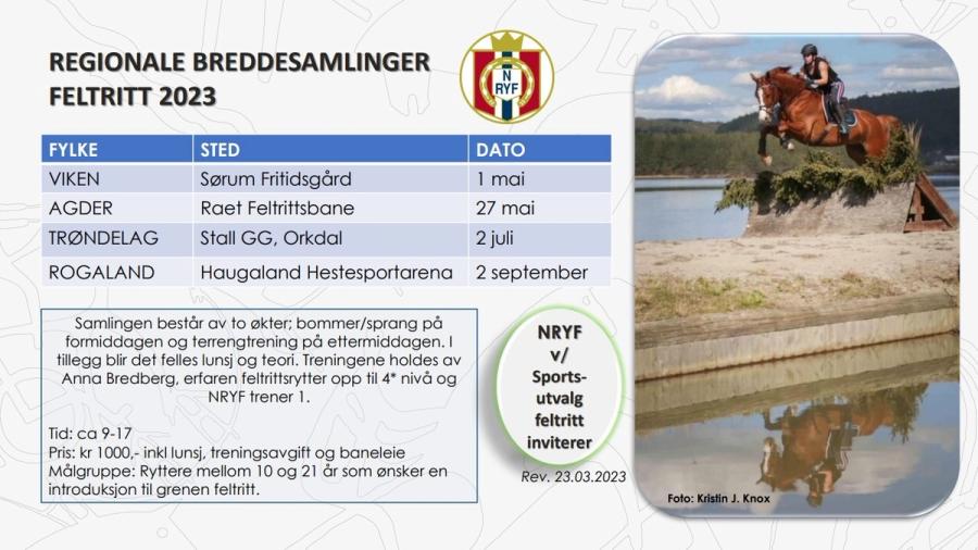 Sportsutvalget i Feltritt tilbyr flere regionale samlinger i 2023. Disse samlingene er for unge ryttere som ønsker en introduksjon til feltrittsporten, samt ryttere som allerede har noe erfaring.