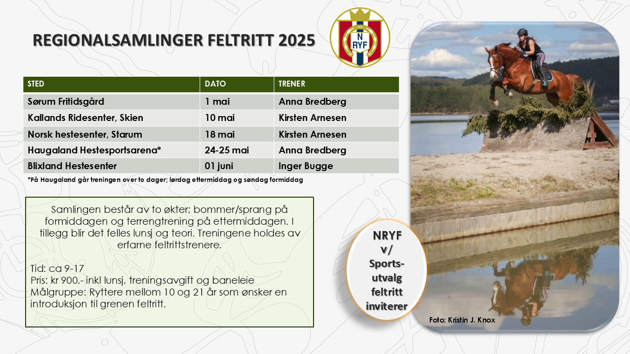 Norges Rytterforbund i regi av Sportsutvalget i feltritt (SU-F) inviterer til regionalsamling. Samlingene arrangeres over store deler av landet, på gode baner og med erfarne trenere.